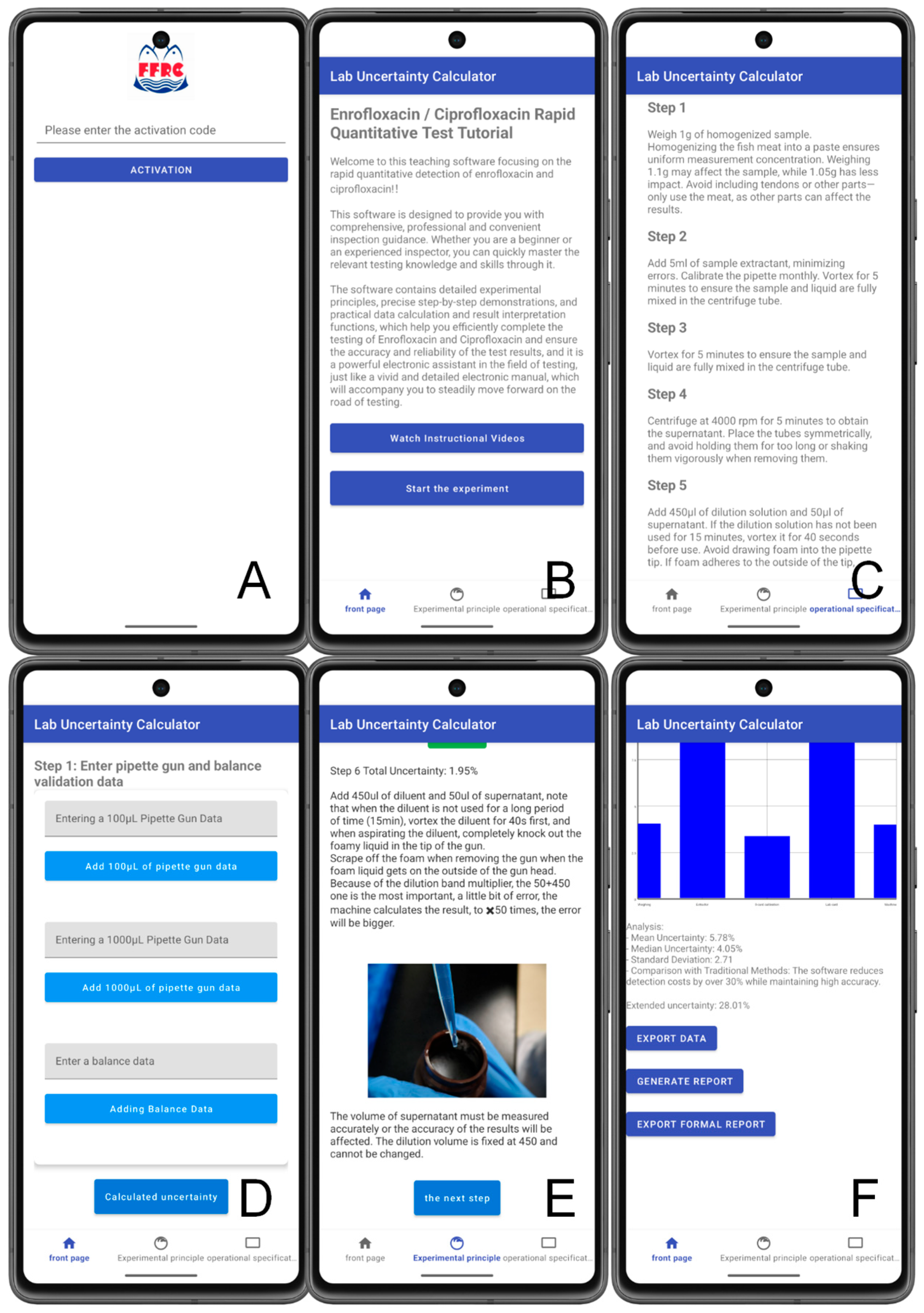 The software is developed natively for Android devices using the Kotlin programming language, providing excellent stability and compatibility for on-site use. It operates smoothly on systems with at least Android 8.0, 2 GB of RAM, and 200 MB of storage, which covers most standard portable devices. Numerical computations leverage Kotlin’s built-in libraries for real-time determination of means, RSD, and expanded uncertainty, with future potential for performance upgrades through JNI-based C++ extensions. The interface design follows Google’s Material Design guidelines, featuring structured layouts, uniform typography, and responsive elements for a clean, consistent user experience. Aligned with the assay workflow, the interface provides step-by-step guidance from pipette calibration and sample preparation to data entry and result validation with immediate feedback if errors occur. This integration translates the once abstract concept of MU into a clear, intuitive, and hands-on experience, reducing the learning curve while enhancing the traceability and standardization of on-site testing.