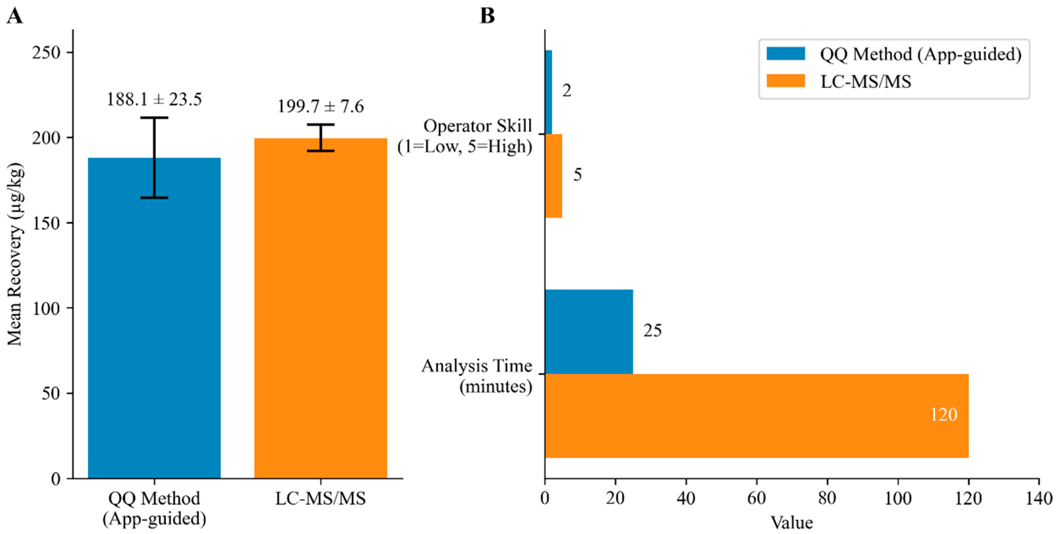 In the comparative analysis of the QQ method and the LC–MS/MS reference method, a qualitative metric termed “Operator Skill” was used to evaluate the level of expertise required for each method. This metric is scored on a 5-point scale, where a score of 1 signifies a layperson with no training, a score of 2 represents an on-site technician after undergoing the brief, standardized training protocol described in this study, and a score of 5 corresponds to a highly specialized expert, such as a Ph.D.-level analyst with extensive experience in chromatography and mass spectrometry. This parameter assesses the intrinsic complexity and skill threshold of the method itself, rather than the performance of an individual operator.