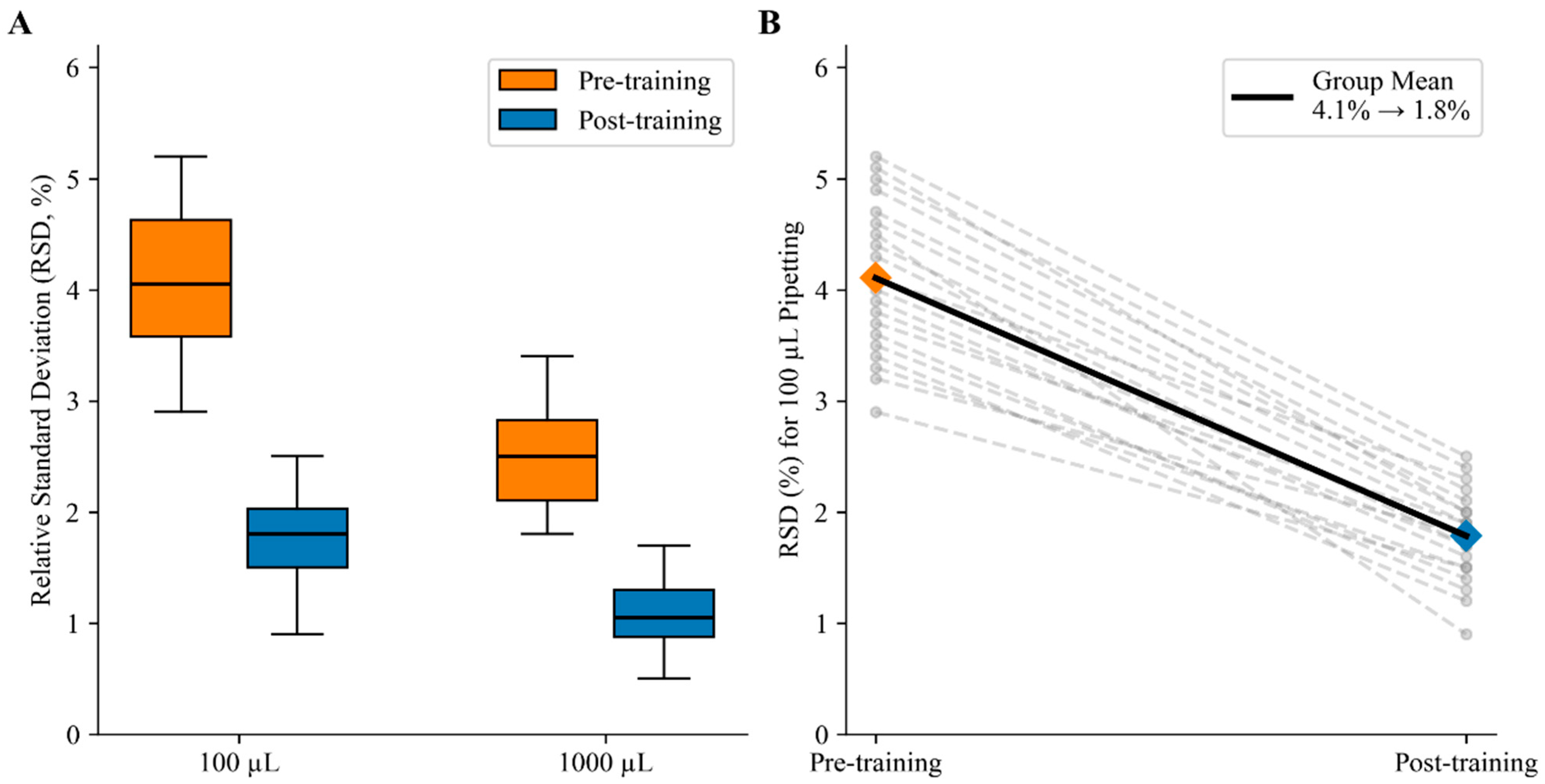 In this study, RSD was used as the primary precision metric for specific steps (e.g., pipetting) and to quantify pre-/post-training improvements.