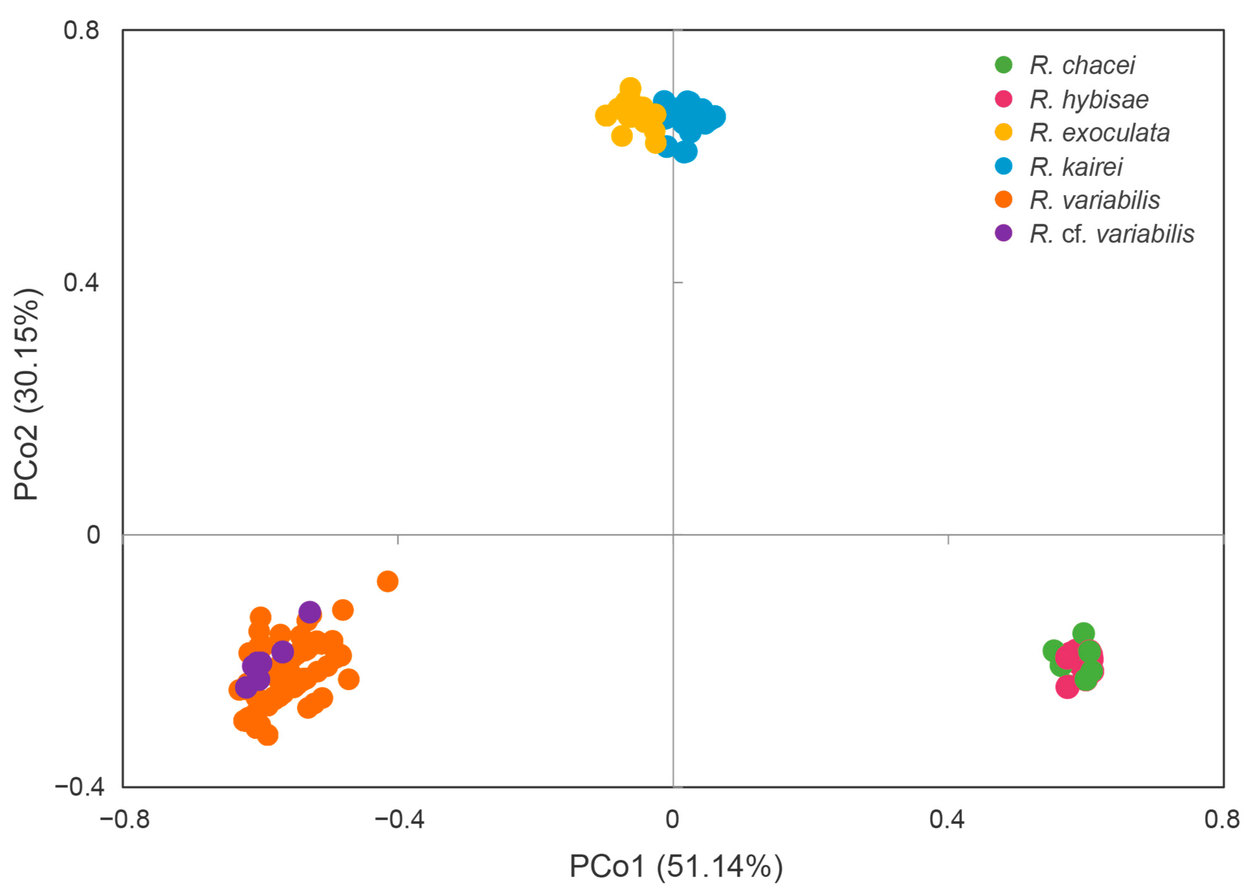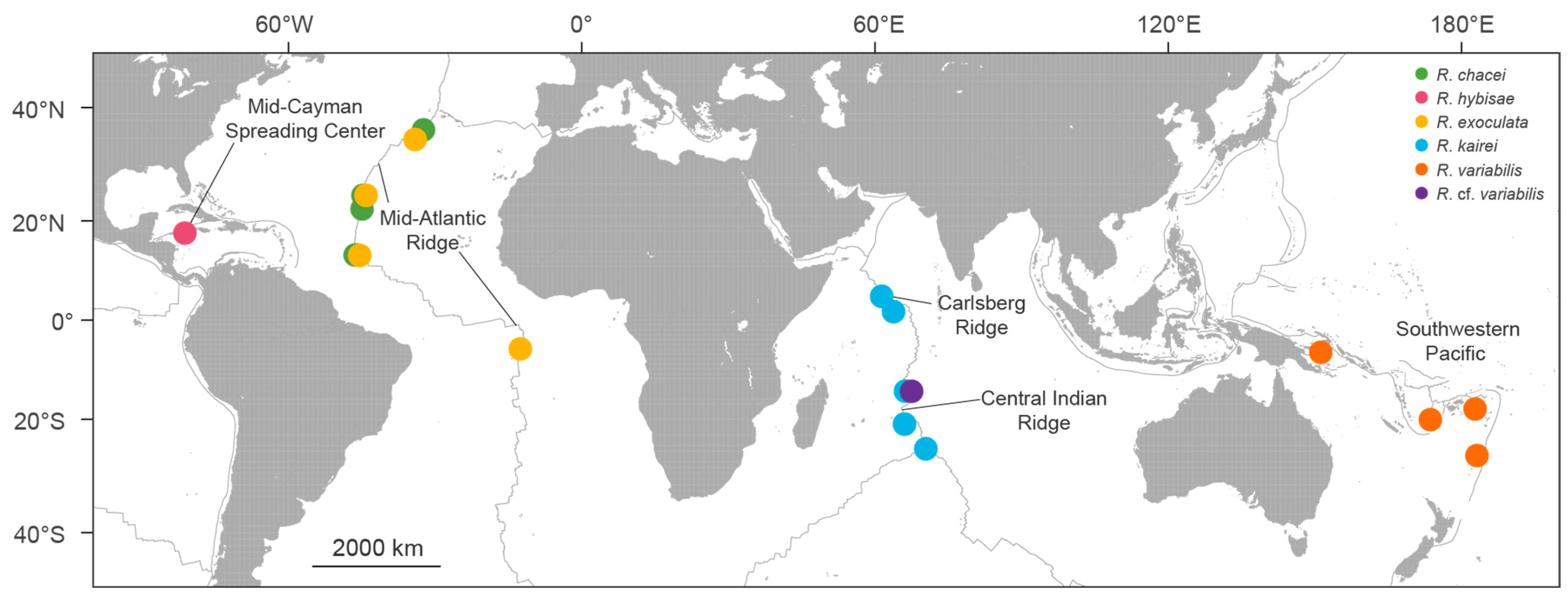 | Species (No., %) † | R. chacei (5, 0.00) | R. hybisae (6, 0.08) | R. exoculata (10, 0.09) | R. kairei (1, –) | R. variabilis (90, 0.13) | R. cf. variabilis (9, 0.25) | |