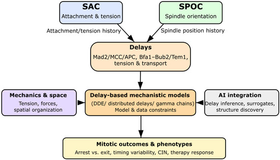 Graphical summary of the review. SAC and SPOC integrate attachment, tension, and spindle orientation over finite timescales. These biological delays are explicitly represented in delay differential equation (DDE) models, which can be coupled to mechanochemical descriptions and AI-based inference frameworks. This delay-aware perspective connects molecular mechanisms to mitotic outcomes, chromosomal instability, and therapy response.