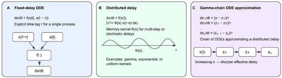 Mathematical representations of delays used in checkpoint modeling. (A) Discrete fixed-delay formulation in which the rate of change depends on both the current and delayed state . (B) Distributed-delay formulation using a memory kernel to weight a continuum of past states. (C) Gamma-chain ODE approximation, where sequential compartments emulate a distributed delay with tunable variance. These formulations form the core mathematical tools used throughout SAC and SPOC delay modeling.