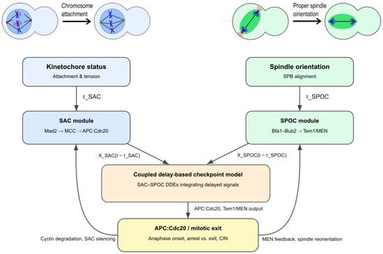 Integrated delay-based SAC–SPOC model architecture. Kinetochore attachment and tension feed the SAC module through the delay , whereas spindle orientation and SPB alignment feed the SPOC module through . Both delayed signals converge in a coupled delay differential equation (DDE) framework regulating APC:Cdc20 activity and mitotic exit, with feedback from cyclin degradation and MEN reorientation closing the control loop.