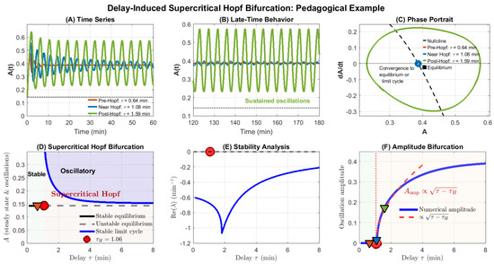 Hopf Bifurcation: Delay-induced transition from a stable steady state to oscillations.