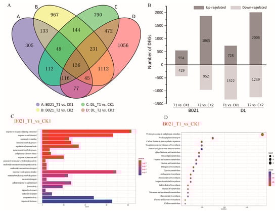 Differential gene expression and functional enrichment analysis under high-temperature stress. (A) Numbers of differentially expressed genes (DEGs) identified in four predefined contrasts (B021_T1 vs. CK1, B021_T2 vs. CK2, DL_T1 vs. CK1, and DL_T2 vs. CK2). (B) Partition of DEGs into up- and down-regulated sets for each contrast, highlighting the stronger early suppression in DL at the pollen-mother-cell (T1) stage. (C,D) GO and KEGG enrichment plots. Abbreviations: T1, pollen-mother-cell stage; T2, tetrad stage; CK, control; and HT, heat treatment.
