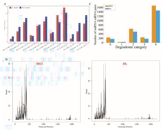 The RNA samples of B021 and DL collected at different stages under control/HT treatment conditions were, respectively, mixed together to generate two degradome libraries. The degradome libraries were constructed according to the method described previously [30]. Then, the constructed library was sequenced (1 × 50 bp single-end sequencing) on an Illumina HiSeq 2500 system (LC-Bio, Hangzhou, China), following the vendor’s procedure.