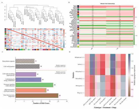 WGCNA modules associated with heat tolerance and pollen performance. (A) Sample and module clustering results based on hierarchical clustering of the topological overlap matrix, showing module assignments (color bands) and the segregation of co-expressed gene sets. (B) Module–trait relationships, presenting Pearson correlations (and corresponding values) between module eigengenes and phenotypic traits (ADR, vigor pollen rate), with positively and negatively associated modules indicated by the color scale. (C) Prioritization of hub genes within trait-associated modules based on high module membership and intra-module connectivity. (D) Eigengene expression profiles across genotypes, developmental stages, and treatment conditions, illustrating genotype- and stage-specific deployment of protective programs under heat.