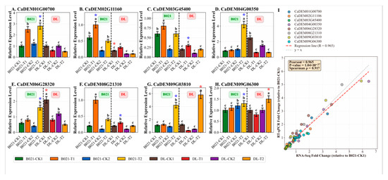 Validation of key gene expression by RT-qPCR. (A–H) Relative expression levels of eight selected genes determined by RT-qPCR across eight sample conditions. Data are presented as mean ± SD (n = 3). Different lowercase letters indicate significant differences (p < 0.05) within each genotype group (B021 or DL). Asterisks indicate significant differences compared to the respective control (B021-CK1 for B021 samples, DL-CK1 for DL samples): * p < 0.05. The vertical dashed line separates B021 (heat-tolerant) and DL (heat-sensitive) genotypes. (A) CaDEM01G00700 (HSP70), (B) CaDEM02G11160, (C) CaDEM03G45400, (D) CaDEM04G00350, (E) CaDEM06G28320, (F) CaDEM08G21310, (G) CaDEM09G03810, and (H) CaDEM09G06300. (I) Correlation analysis between RNA-Seq and RT-qPCR fold-change values. Each point represents a gene–sample combination (n = 64). The red dashed line indicates the regression line (R = 0.965, p < 0.001). The gray dashed line represents y = x (perfect agreement).