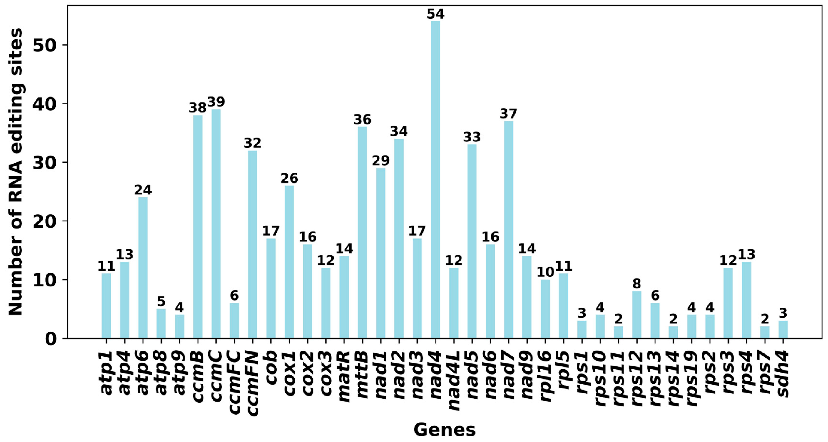 3.6. RNA Editing Sites in PCGs