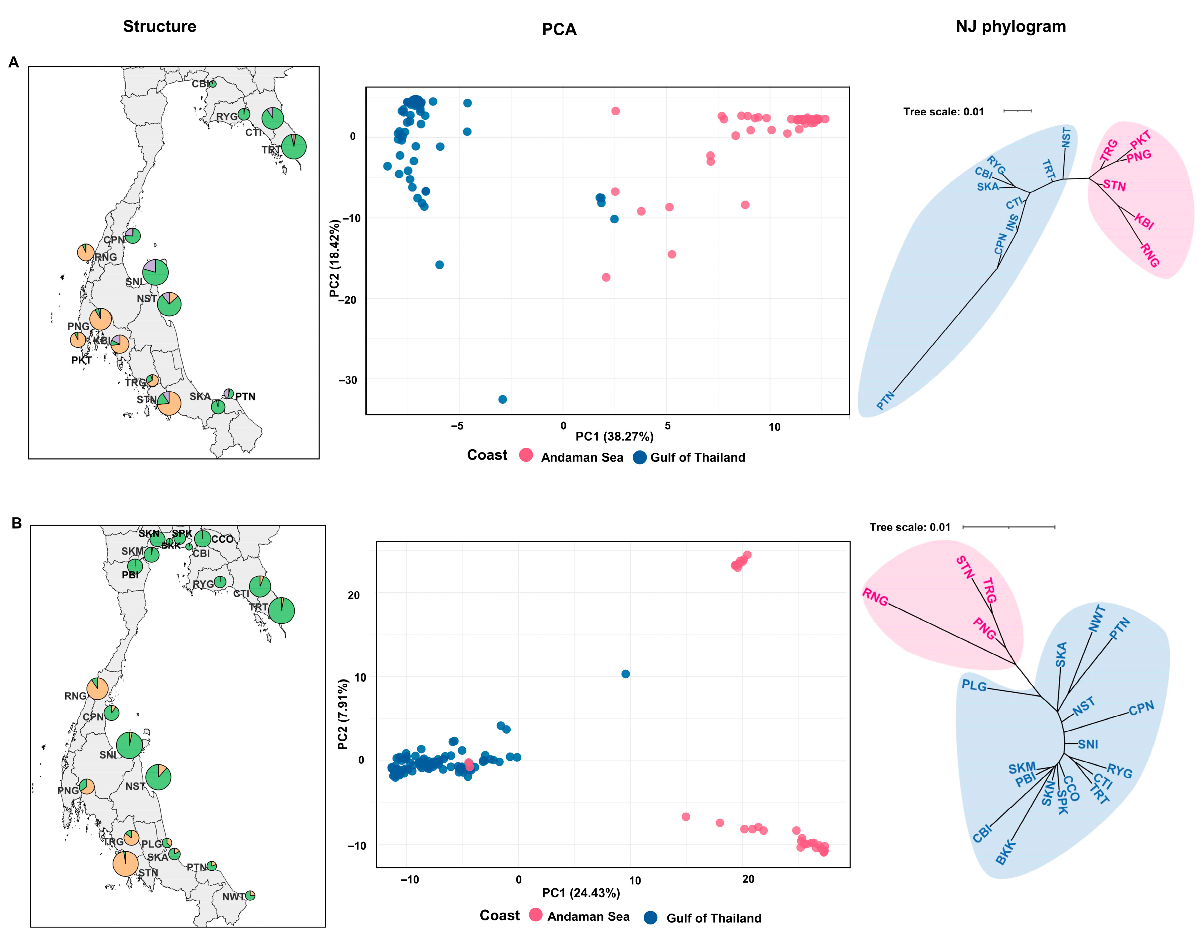 - Ruang-areerate, P.; Naktang, C.; Kongkachana, W.; Sangsrakru, D.; Narong, N.; Maknual, C.; Pravinvongvuthi, T.; Promchoo, W.; Yamprasai, S.; Tangphatsornruang, S.; et al. Assessment of the Genetic Diversity and Population Structure of Rhizophora apiculata Blume (Rhizophoraceae) in Thailand. Biology 2022, 11, 1449. [Google Scholar] [CrossRef]