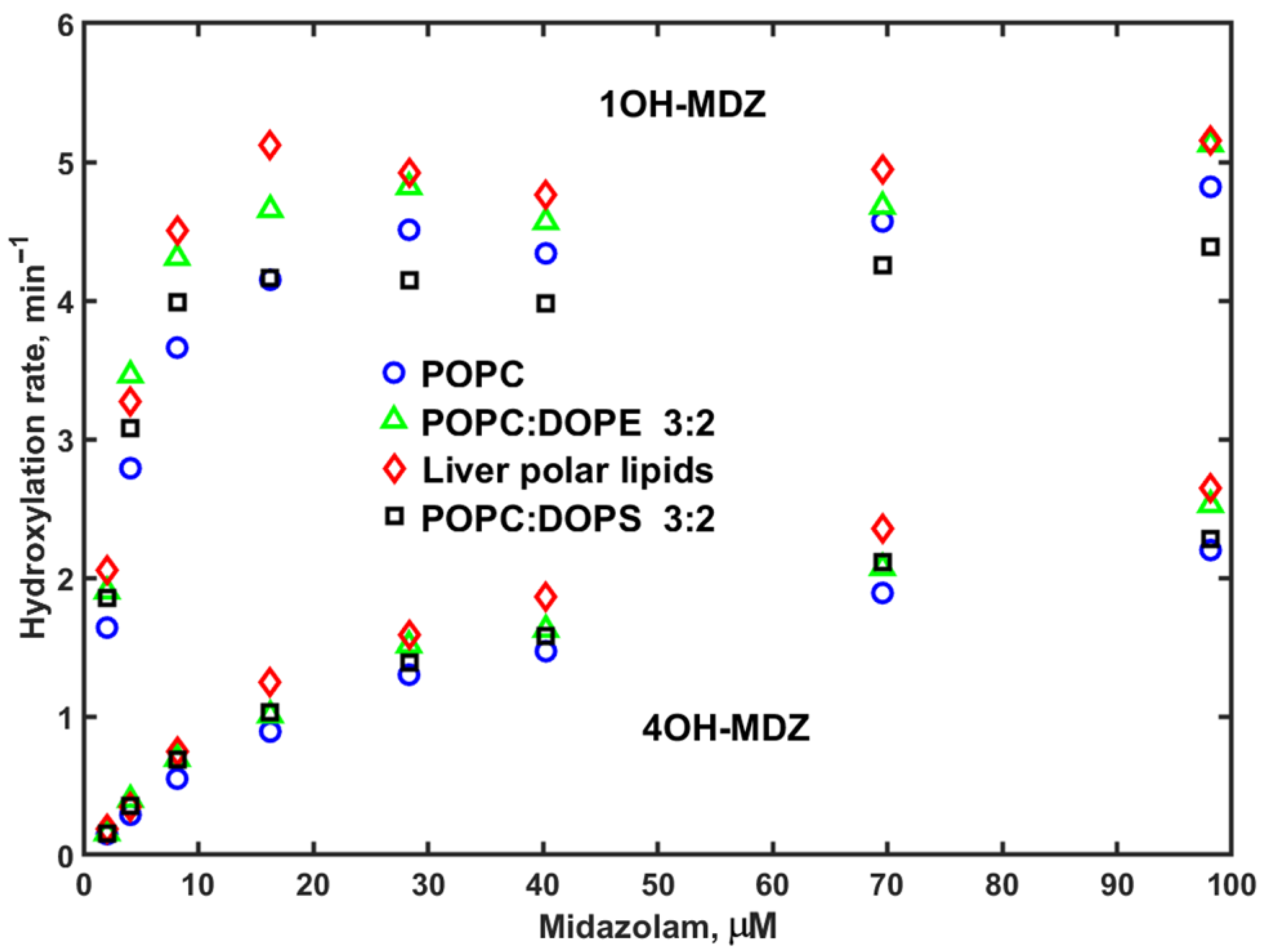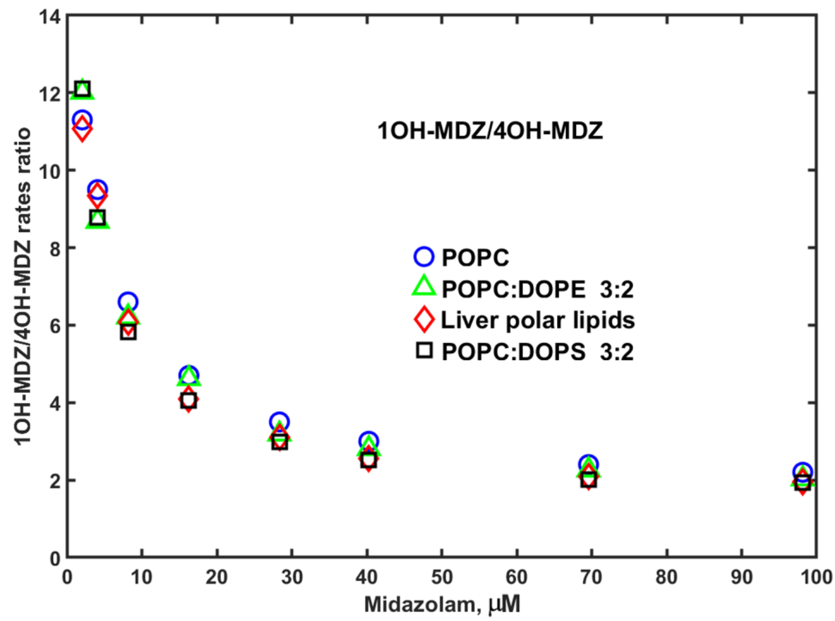 - Denisov, I.G.; Grinkova, Y.V.; Camp, T.; McLean, M.A.; Sligar, S.G. Midazolam as a Probe for Drug-Drug Interactions Mediated by CYP3A4: Homotropic Allosteric Mechanism of Site-Specific Hydroxylation. Biochemistry 2021, 60, 1670–1681. [Google Scholar] [CrossRef]