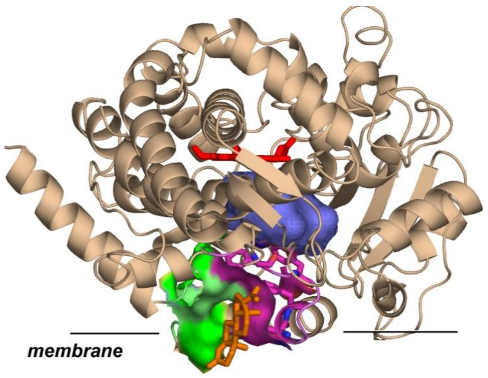 - Berka, K.; Paloncyova, M.; Anzenbacher, P.; Otyepka, M. Behavior of Human Cytochromes P450 on Lipid Membranes. J. Phys. Chem. B 2013, 117, 11556–11564. [Google Scholar] [CrossRef] [PubMed]