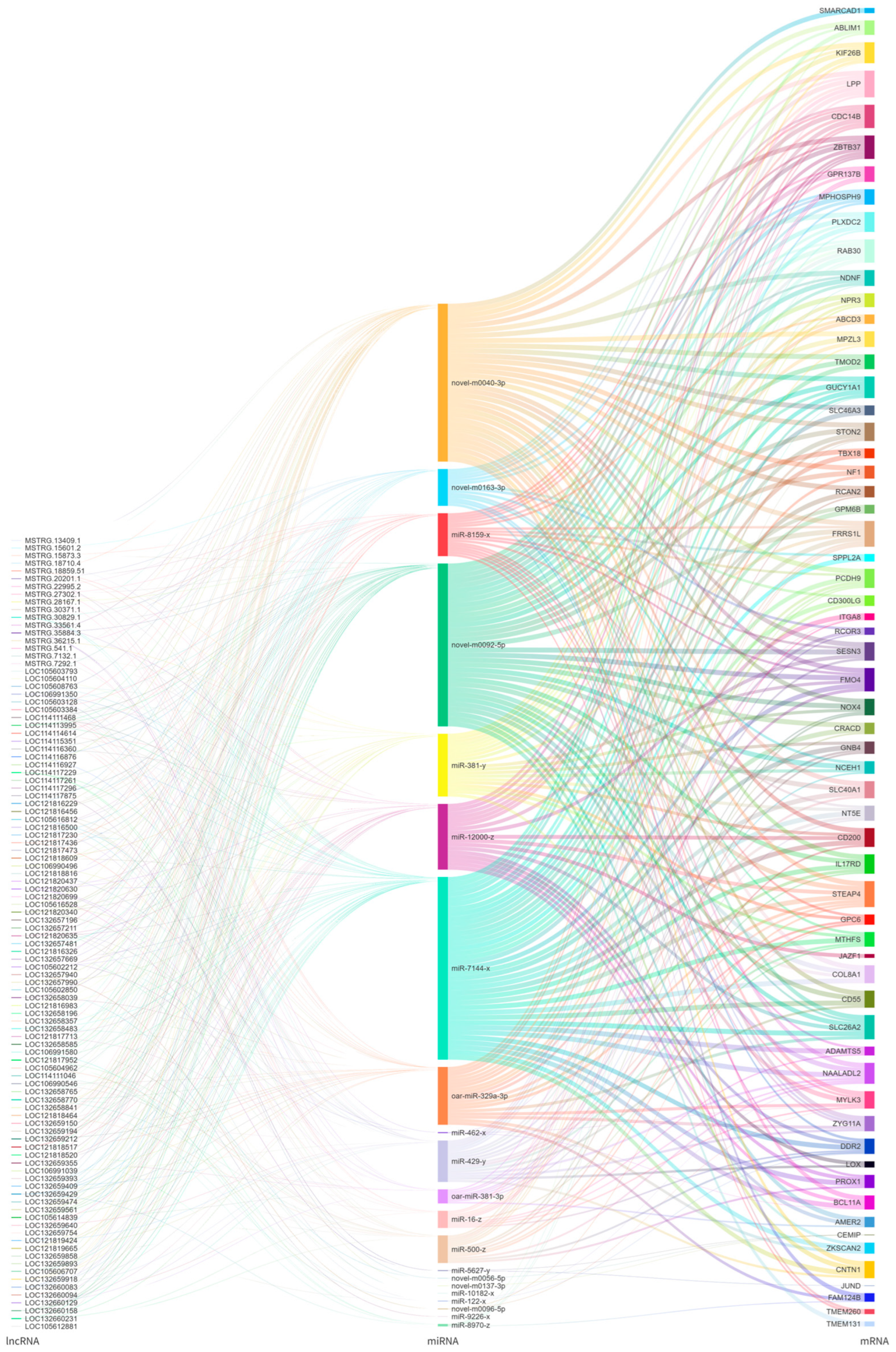 3.5. lncRNA-miRNA-mRNA Network Construction