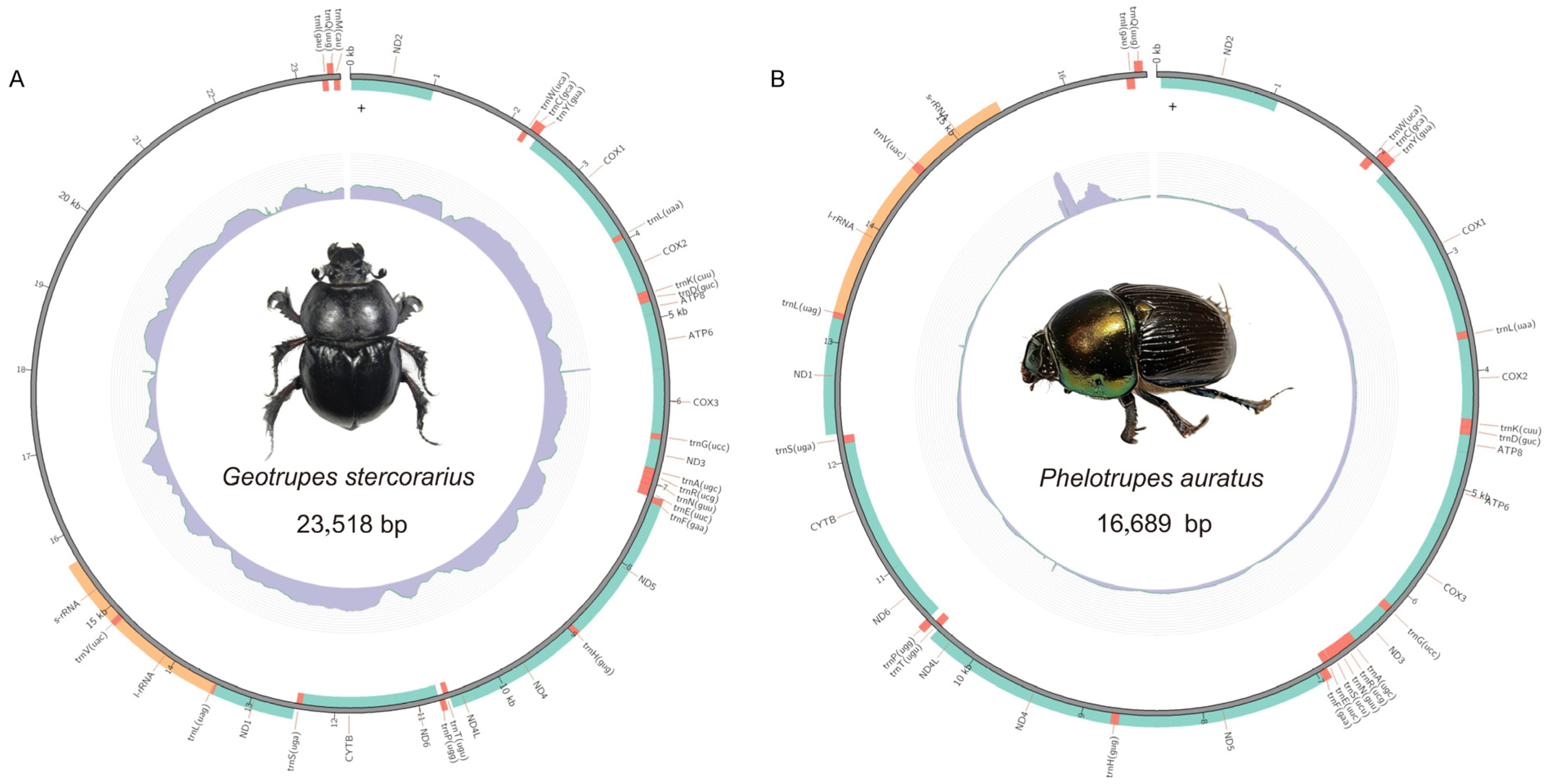 - Zhang, H.H.; He, Q.J.; Zhao, Z.Y.; Zhang, B.; Zhou, J.; Wang, C.Y.; Yi, C.H.; Zhao, M. Mitochondrial genome comparison and phylogenetic analysis of four species of dung beetles (Coleoptera: Scarabaeidae: Scarabaeinae). Ecol. Evol. 2025, 15, e71906. [Google Scholar] [CrossRef] [PubMed]