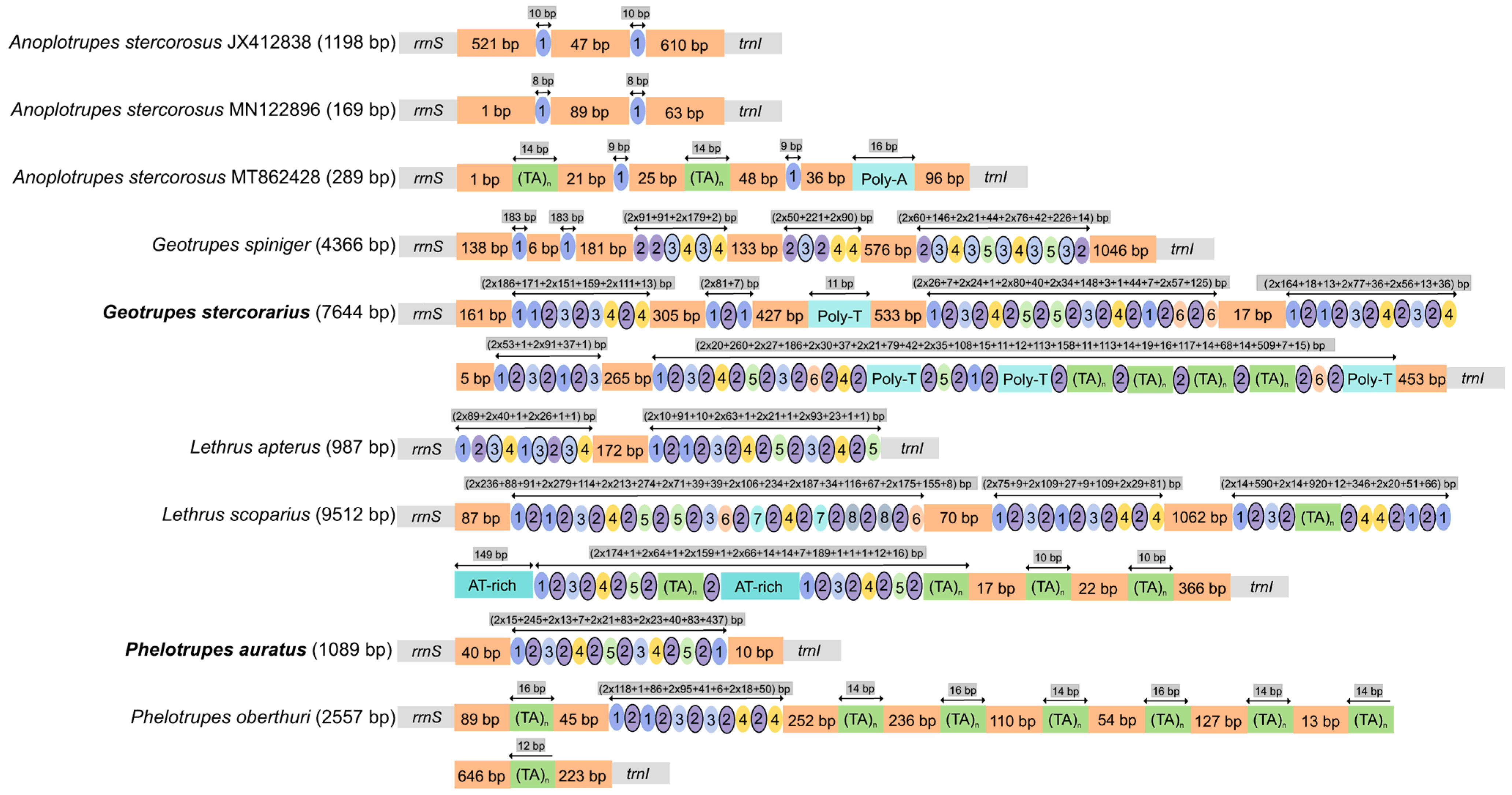 4.2. Conserved and Variable Features in Geotrupidae Mitogenomes