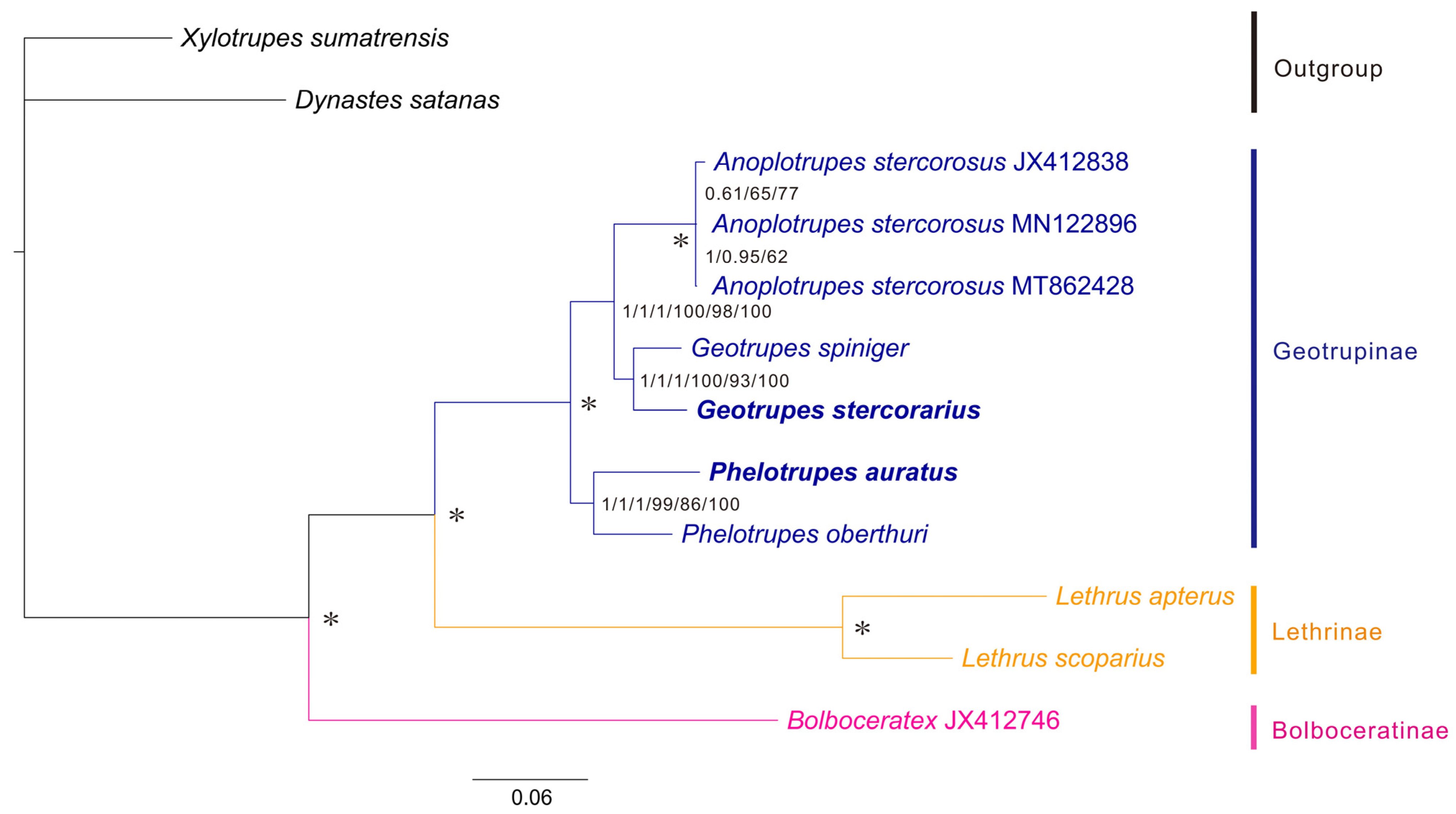 4.1. A Robust Phylogenetic Framework for Geotrupidae and Its Taxonomic Implications