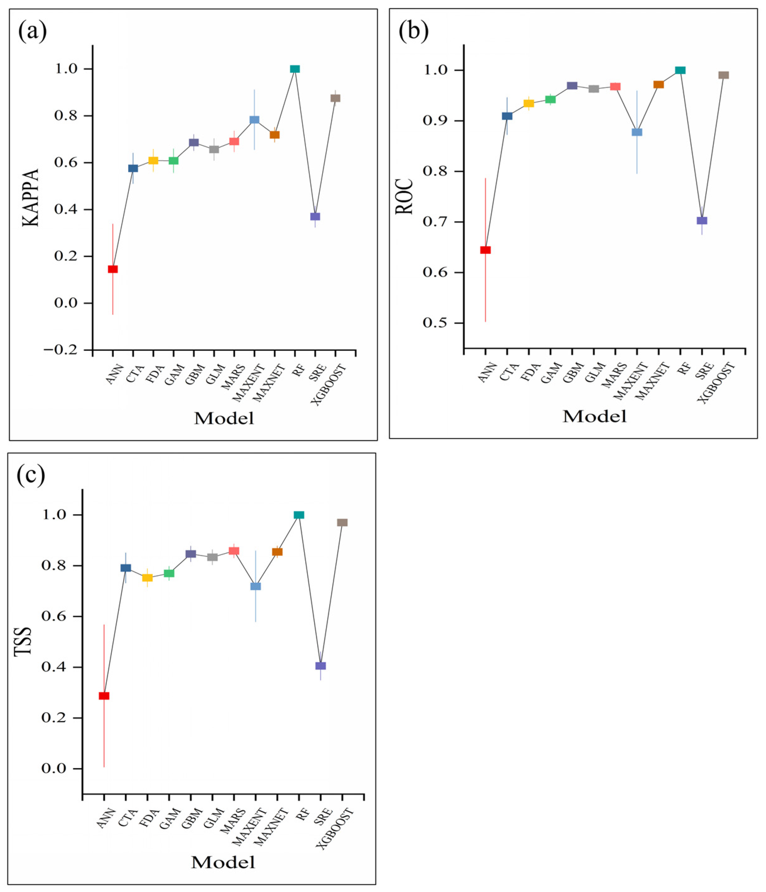 - Duan, R.-Y.; Kong, X.-Q.; Huang, M.-Y.; Fan, W.-Y.; Wang, Z.-G. The predictive performance and stability of six species distribution models. PLoS ONE 2014, 9, e112764. [Google Scholar] [CrossRef] [PubMed]