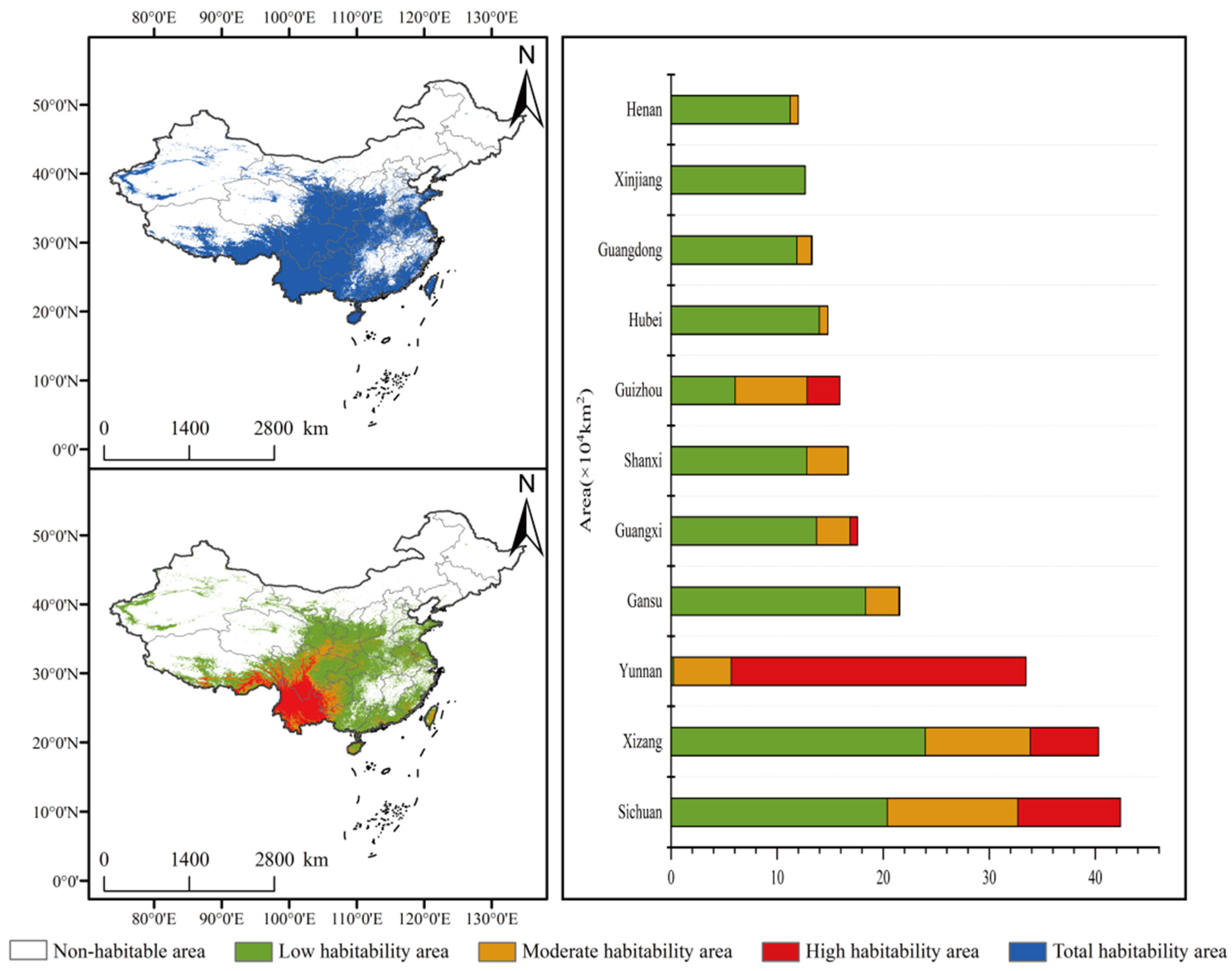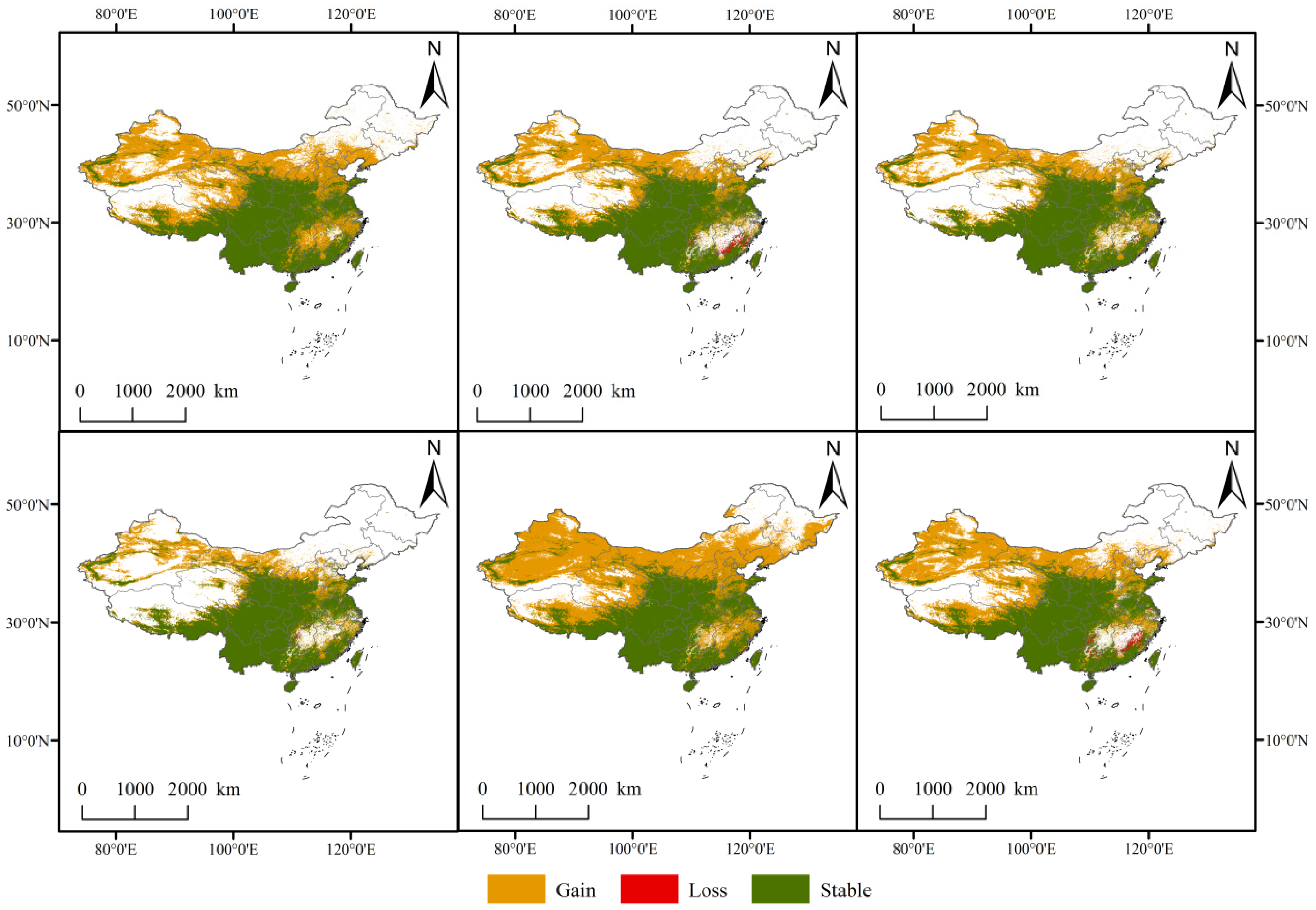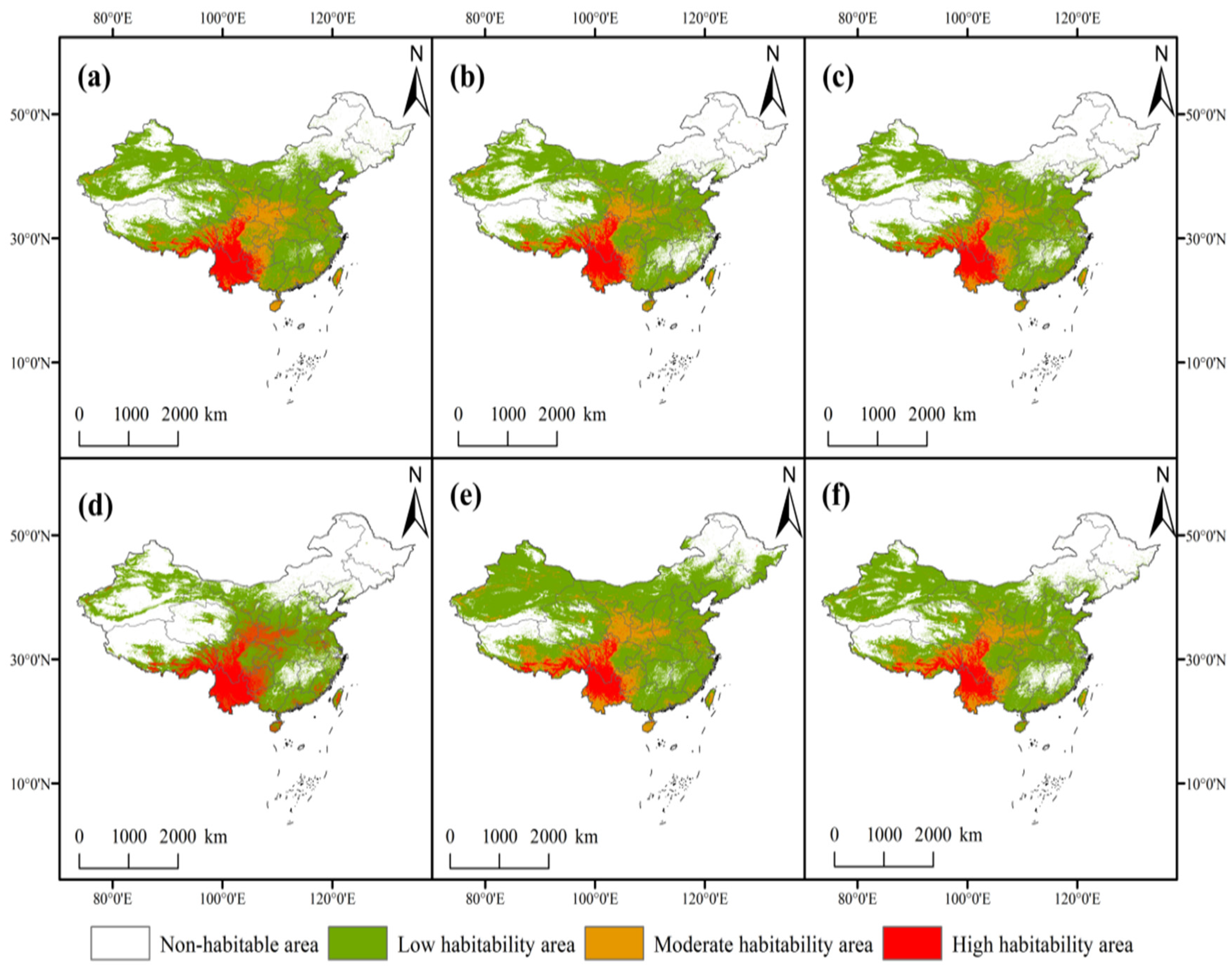 | Climate Scenarios | Total Suitability Area (104 km2) | Contraction Area (104 km2) | Contraction Rate (%) | Unchanged Area (104 km2) | Unchanged Rate (%) | Expansion Area (104 km2) | Expansion Rate (%) |
