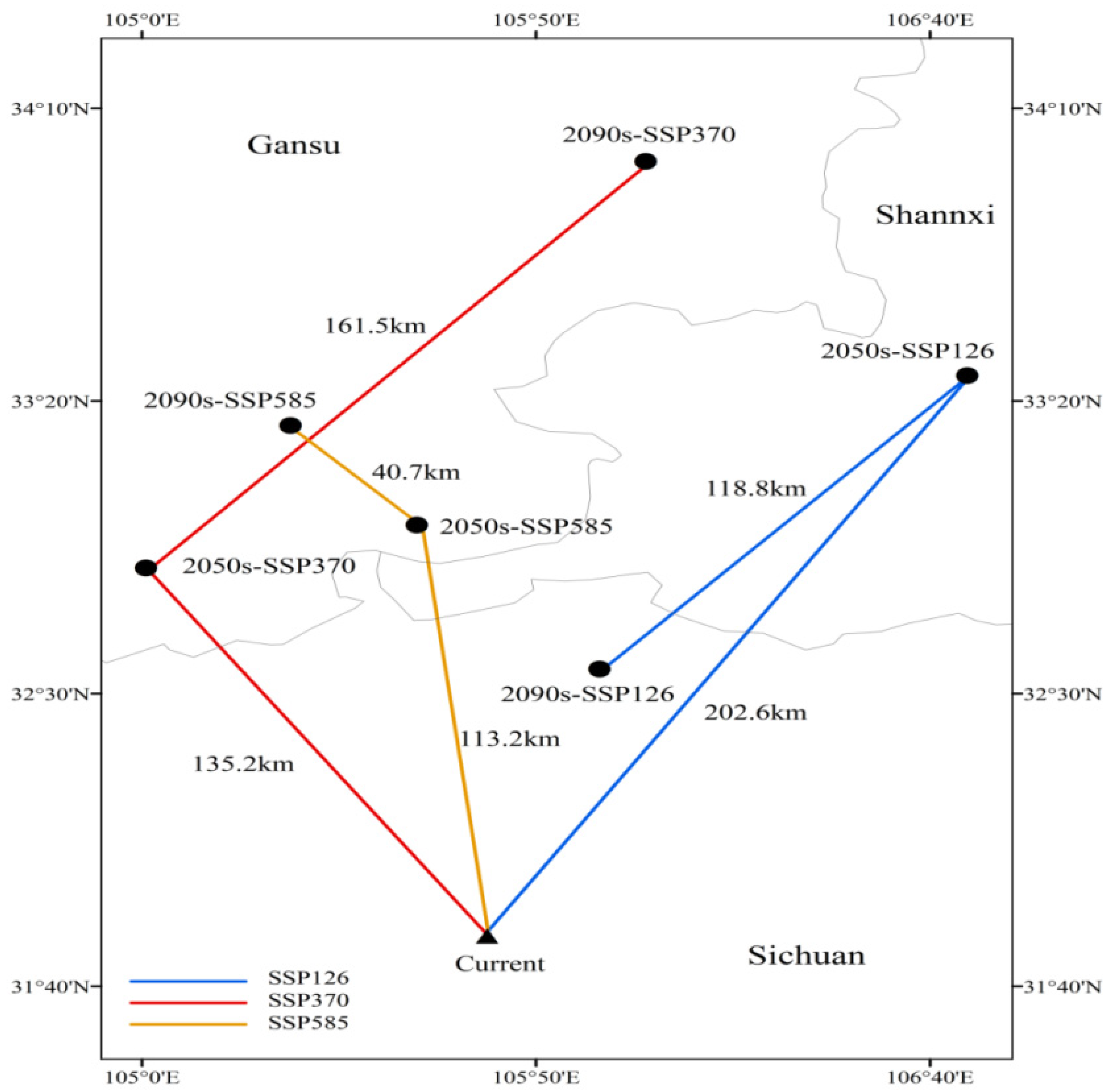 3.5. Overlap of Suitable Areas and Centroid Migration in Future Periods