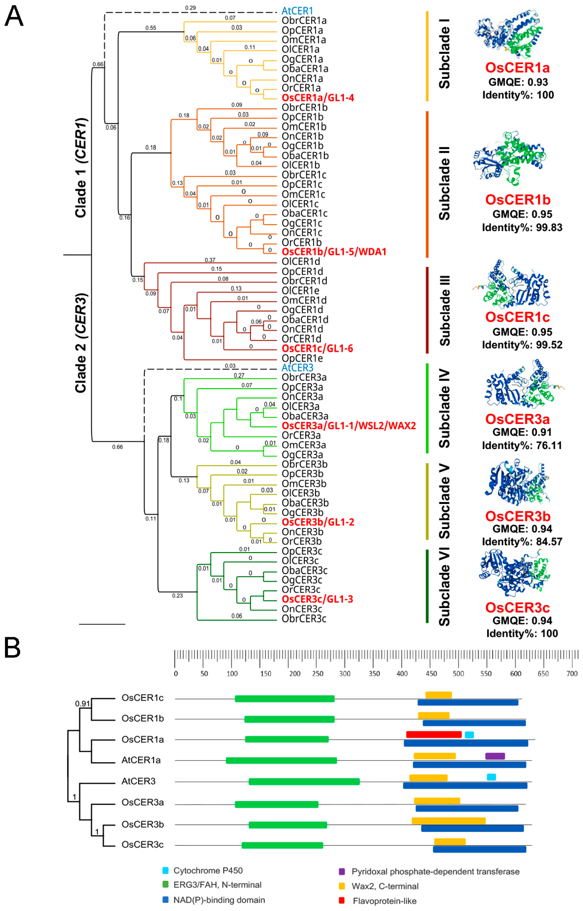 - Chaudhary, K.; Geeta, R.; Panjabi, P. Origin and diversification of ECERIFERUM1 (CER1) and ECERIFERUM3 (CER3) genes in land plants and phylogenetic evidence that the ancestral CER1/3 gene resulted from the fusion of pre-existing domains. Mol. Phylogenet. Evol. 2021, 159, 107101. [Google Scholar] [CrossRef] [PubMed]