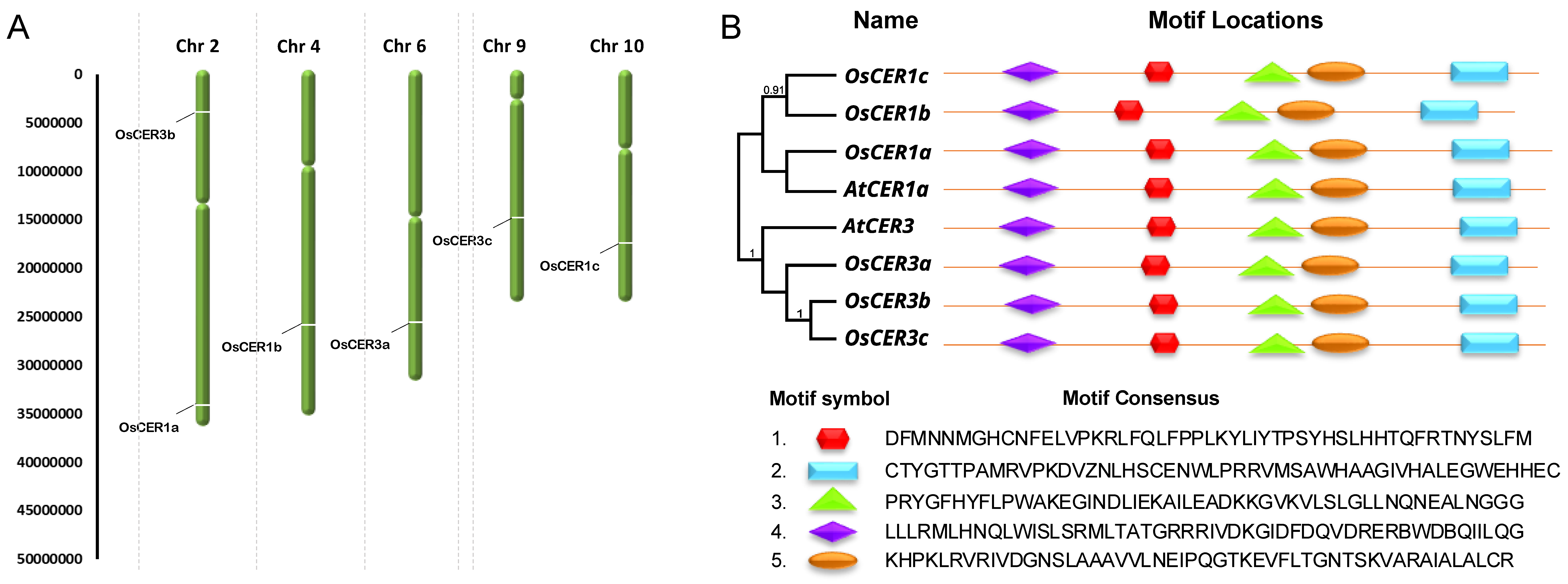 3.2. Chromosome Localization and the Conserved Motifs of Rice CER1 and CER3 Genes