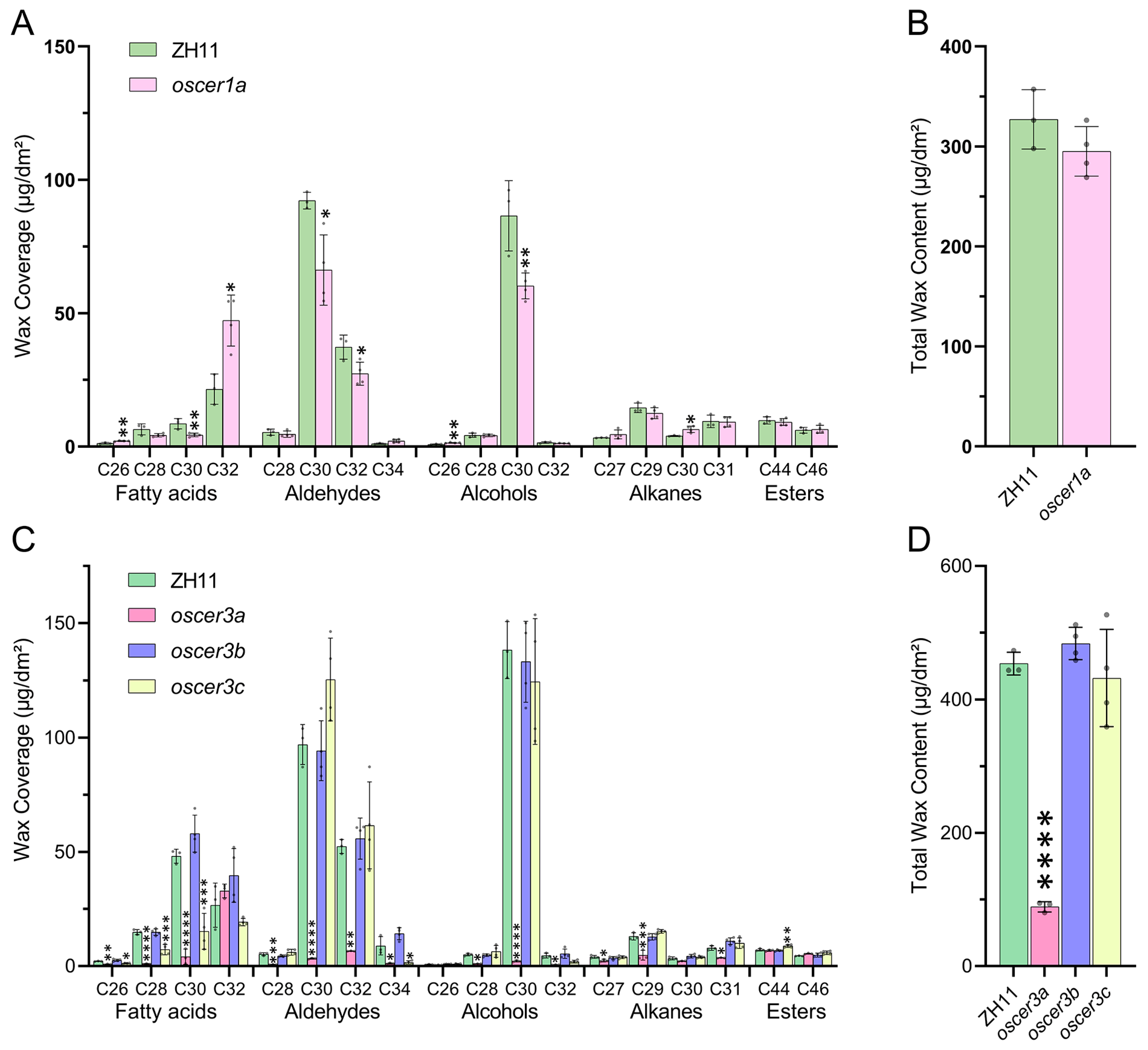 3.6. Distinct Roles of OsCER1a and OsCER3s in Shaping Rice Cuticular Wax