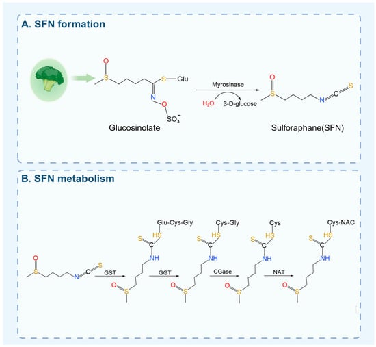The formation and metabolic process of SFN. (A) SFN is generated from glucosinolates via hydrolysis by myrosinase, an enzyme activated upon plant tissue damage. Yield is influenced by source and processing, with broccoli sprouts containing significantly higher levels than mature florets. (B) GST catalyzes the conjugation of SFN with GSH to form SFN-GSH. This conjugate is then further processed in a stepwise manner: it is first hydrolyzed by γ-glutamyl transpeptidase to SFN-Cys-Gly, then converted to SFN-Cys by dipeptidase, and finally acetylated by N-acetyltransferase to yield SFN-NAC.