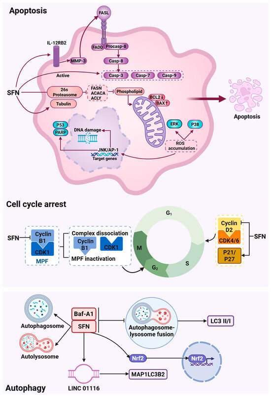 SFN induces tumor cell fate decisions via mechanosensitive pathways. SFN orchestrates cell cycle arrest, apoptosis, and autophagy, processes regulated by mechanical tension and adhesion. Cell cycle arrest: SFN disrupts key cyclin/CDK complexes and upregulates CDK inhibitors (p21, p27), arresting cells at G1/S and G2/M checkpoints. This may involve the inhibition of proliferation-associated mechanotransduction through FAK/Src and Rho/ROCK signaling. Apoptosis: SFN triggers both extrinsic and intrinsic mitochondrial pathways by altering the Bax/Bcl-2 ratio, inducing ROS, and activating executioner caspases. Concurrent proteasome inhibition disrupts the turnover of structural proteins, compounding biomechanical stress. Autophagy: SFN can induce a pro-survival autophagic response via Nrf2 activation, potentially to clear damaged cytoskeletal components. When autophagic flux is blocked, this process shifts toward promoting cell death.