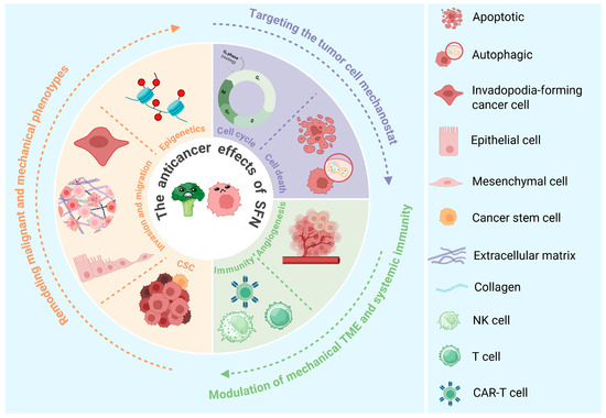 Sulforaphane as a multi-scale “mechano-modulator” in cancer. This schematic integrates SFN’s pleiotropic anticancer effects through the unifying lens of biomechanical normalization across scales. Molecular/cellular scale: SFN destabilizes the force-generating cytoskeleton, inducing cell cycle arrest and cell death (apoptosis and autophagy). Multicellular/tissue scale: SFN remodels the ECM, targets epigenetic modulation and CSCs in their niche, and may promote vascular normalization. Systemic scale: SFN enhances immune cell infiltration and function while inhibiting angiogenesis. These coordinated actions disrupt the distorted tumor mechano-environment, underpinning SFN’s efficacy against migration and invasion.