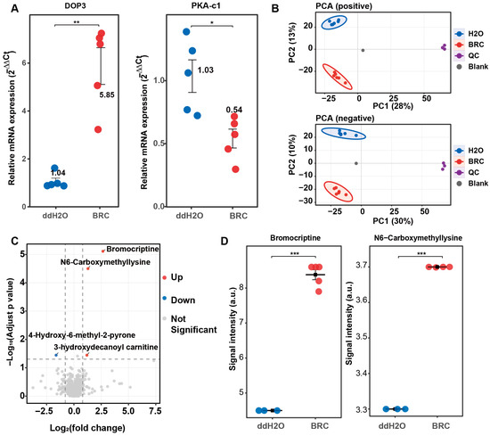 To investigate the regulatory role of dopamine signaling in energy metabolism in honeybee brains, we established a dopamine receptor agonist (BRC) treatment model. The efficacy of the pharmacological manipulation was validated via qPCR before metabolomic analysis. Compared with the control group (ddH2O), the relative mRNA expression of the D2-like dopamine receptor gene Dop3 was higher in the BRC-treated group (p < 0.01), whereas expression of the downstream effector gene protein kinase A catalytic subunit 1 (PKA-c1) was lower (p < 0.05) (Figure 1A). These changes in gene expression indicated activation of the dopamine receptor signaling pathway.