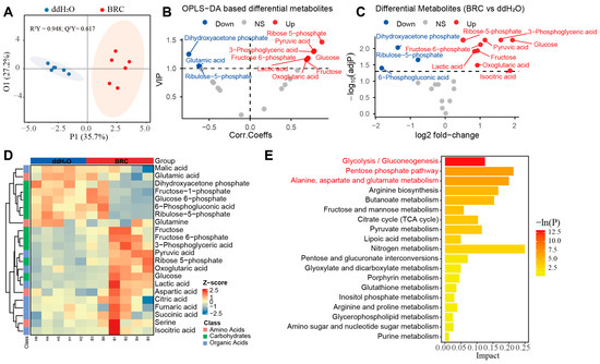 Targeted metabolomic profiling of energy metabolism pathways. (A) Orthogonal partial least squares discriminant analysis (OPLS-DA) score plot. The x-axis (P1) represents the predictive component, and the y-axis (O1) represents the orthogonal component, with the percentage of explained variance shown in parentheses. Colors distinguish the experimental groups (ddH2O: blue; BRC: red), and shaded areas represent confidence regions. OPLS-DA score plots showing separation between BRC and control groups (R2Y = 0.948; Q2Y = 0.617; permutation test p < 0.05). (B) Variable importance in projection (VIP) derived from the OPLS-DA model. The x-axis displays the correlation coefficients (Corr. Coeffs), and the y-axis displays the VIP scores. Points are colored according to their differential status (red: upregulated; blue: downregulated; gray: non-significant). (C) Volcano plot of targeted energy metabolites. The x-axis represents the log2 fold change, and the y-axis represents the −log10(adjusted p-value). Red and blue points denote upregulated and downregulated metabolites, respectively, while gray points indicate no significant difference. (D) Hierarchical clustering heatmap of differential metabolites. Rows correspond to individual metabolites, and columns correspond to samples (top annotation bars: blue for ddH2O, red for BRC). The color scale represents the row-scaled Z-score of metabolite abundance (purple: low abundance; orange: high abundance). The dendrogram on the left illustrates the clustering hierarchy of the metabolites. (E) Bar chart of KEGG pathway enrichment analysis. The x-axis represents the pathway Impact score, and the y-axis lists the enriched metabolic pathways. The color gradient of the bars corresponds to the statistical significance level −ln(P). The legend indicates the classification of metabolic pathways (amino acids, carbohydrates, organic acids).