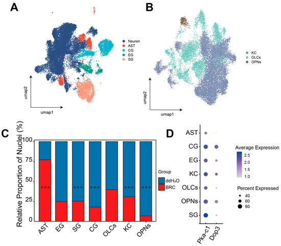 To identify the specific cellular populations driving the observed systemic upregulation of glycolytic and pentose phosphate pathways, we performed single-nucleus transcriptomic analysis, initially characterizing cell-type-specific compositional shifts and dopamine receptor distributions. Analysis of 34,232 high-quality nuclei identified major neuronal (KCs, OLCs, OPNs) and glial (SG, CG, EG, AST) populations (Figure 3A,B and Figure S2A,B). Using the scProportionTest algorithm, we quantified differences in the relative abundance of recovered nuclei between BRC and control datasets. We found that the BRC group exhibited lower recovered proportions of OPNs, CG, SG, and KCs and a higher proportion of AST (Figure 3C, Table S7). We then mapped Dop3 and PKA-c1 expression across cell types. Dop3 was mainly expressed in KCs, CG, and OPNs, whereas PKA-c1 showed broad expression across clusters (Figure 3D).