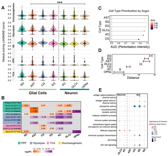Cell-type-specific metabolic pathway activity and enzymatic transcriptional signatures. (A) Distribution of metabolic pathway module scores across cell types. Violin plots visualize the density and distribution of JASMINE module scores for key metabolic pathways (gluconeogenesis, glycolysis, IIS, PPP, and TCA cycle) across seven major cell clusters. Internal boxplots represent the statistical summary: the center line indicates the median, box limits define the interquartile range (IQR), and whiskers extend to 1.5× IQR. Statistical comparisons were performed between the aggregate glial population (SG, AST, CG, EG) and the neuronal population (KCs, OLCs, OPNs) using a two-sided Wilcoxon rank-sum test. Asterisks denote significant shifts in score distributions consistently observed across all examined metabolic pathways. (*** p < 0.001). (B) Heatmap profiling the transcriptional changes in rate-limiting metabolic enzymes. The color gradient represents the log2 fold change (log2FC) in BRC-treated nuclei relative to controls (orange: upregulated; purple: downregulated; gray: non-significant or low expression). Numerical values within cells indicate the specific log2FC. Gene names are color-coded by metabolic pathway: pentose phosphate pathway (green), glycolysis (purple), TCA cycle (pink), and gluconeogenesis (yellow). (C) Quantification of transcriptional perturbation intensity by Augur (v1.0.0). The dot plot displays the Area Under the Curve (AUC) for each cell type, serving as a metric for the magnitude of the transcriptional response to BRC treatment. Higher AUC values indicate greater responsiveness. (D) Statistical distance analysis using scDist (v1.1.5). The plot shows the estimated mixed-effects distance (dimensionless units in PC space) between BRC and control conditions for each cell type. Error bars represent 95% confidence intervals. (E) Functional enrichment divergence between neurons and glia. The dot plot compares representative enriched Gene Ontology (GO) terms highlighting the functional distinction across cell types. Dot size corresponds to the number of significant genes, and the color scale indicates the direction and significance of regulation (red: upregulated; blue: downregulated).