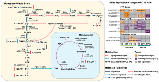 Integrated multi-omics analysis of the central metabolic network. The left panel displays the mapped changes in metabolites and enzymatic pathways within glycolysis, the pentose phosphate pathway (PPP), and the TCA cycle. Metabolites with red text/arrows indicate upregulation, while blue indicates downregulation (Log2FC, BRC vs. H2O). “VIP > 1” denotes metabolites with variable importance in projection scores greater than 1 in OPLS-DA. The dashed blue arrows represent the pathway leading to CML formation. The right panel shows a heatmap of differential gene expression (Log2FC) for key metabolic enzymes across distinct glial (SG, AST, CG, EG) and neuronal (KC, OLCs, OPNs) clusters. Orange indicates upregulation, purple indicates downregulation, and gray indicates non-significant changes (p_adj > 0.05).