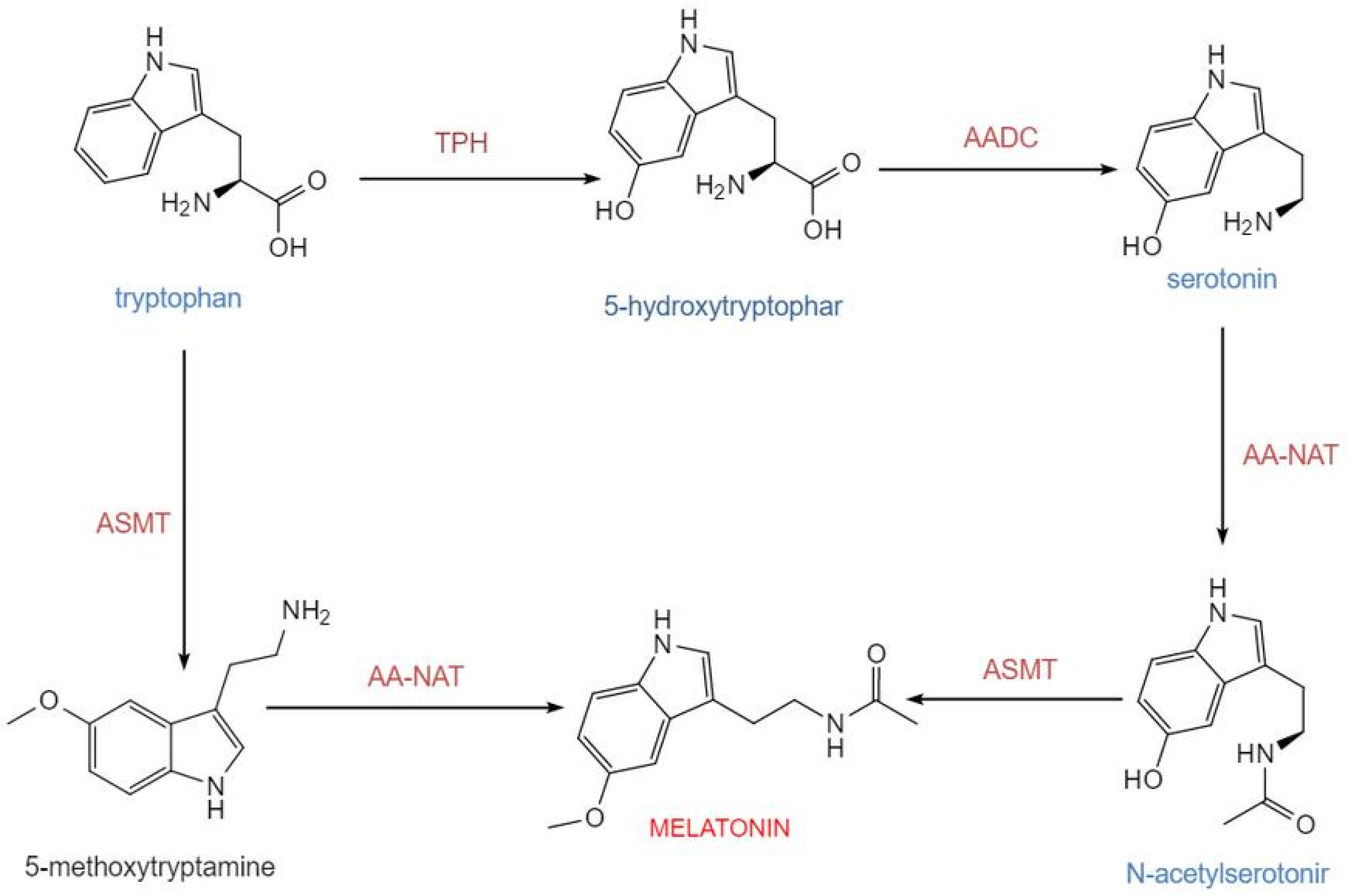 - Zhong, J.; Lu, Z.; Zhou, Z.; Ma, N.; Li, Y.; Hu, J.; Wan, B.; Lu, W. Melatonin biosynthesis and regulation in reproduction. Front. Endocrinol. 2025, 16, 1630164. [Google Scholar] [CrossRef]