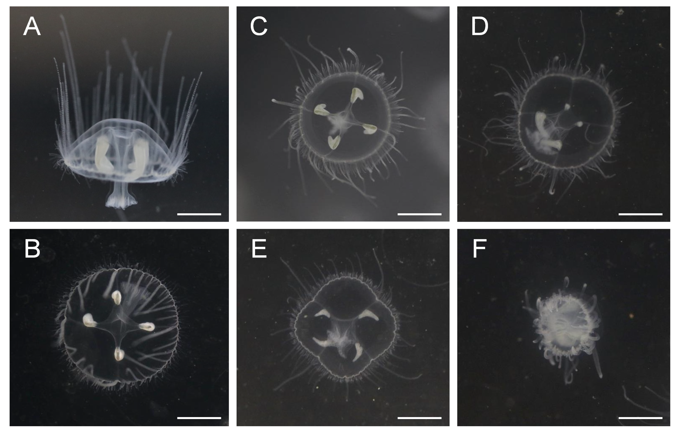 - Winata, K.; Zhu, J.A.; Hanselman, K.M.; Zerbe, E.; Langguth, J.; Folino-Rorem, N.; Cartwright, P. Life Cycle Transitions in the Freshwater Jellyfish Craspedacusta sowerbii. Biology 2024, 13, 1069. [Google Scholar] [CrossRef]