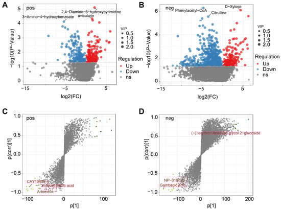 Metabolomic profiling of L. aurea under high- and low-moisture conditions. (A) Volcano plot of differentially expressed metabolites (DEMs) in the positive ion mode, showing upregulated, downregulated, and non-significant metabolites with variable importance in projection (VIP) scores indicated by point size. (B) Volcano plot of DEMs in the negative ion mode. (C) S-plot from OPLS-DA analysis in the positive ion mode highlighting metabolites contributing strongly to group separation. (D) S-plot from OPLS-DA analysis in the negative ion mode. Green points denote key metabolites with high variable weights in each model.