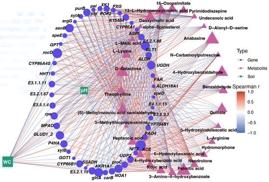 Correlation network analysis integrating soil variables, DEGs, and DEMs revealed a tightly connected regulatory structure linking soil moisture, pH, metabolic shifts, and drought-responsive gene expression in L. aurea (Figure 6). Soil WC and pH showed strong positive and negative correlations, respectively, with distinct sets of genes-including UGDH, ALDH, GLT1, ASP5, GLUD1/2, NIT2, PXG, P4HA, rpe, xylA/xylB, argG, asnB, carB, and NOA1-indicating that soil moisture acts as major environmental elements of transcriptional remodeling. These genes, many of which correspond to the four core pathways identified earlier (amino acid metabolism, cell wall modification, cutin-suberin-wax biosynthesis, and proline/arginine cycling), were strongly associated with drought-responsive metabolites such as 16-oxopalmitate, alpha-spinasterol, anabasine, 4-hydroxybenzoic acid, and N-carbamoylputrescine, which appeared on the highly correlated positive side of the network. Conversely, metabolites including L-malic acid, L-lysine, quinate, 3-methylthiopropanamine, and D-galactose were positioned within negatively correlated clusters.