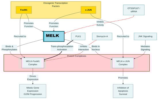 Furthermore, the observation that MELK knockdown produces differential effects across cancer subtypes further supports this hypothesis. In TNBC and glioma stem cells, MELK depletion triggers G2/M phase arrest and apoptosis, whereas in bladder cancer and non-TNBC cell lines, G1/S phase arrest predominates [9,29,43]. These mechanistic differences indicate that MELK interacts with different regulatory networks depending on the cellular context. MELK in TNBC interacts with the MELK-FOXM1 axis that regulates mitotic transcription factors and fosters stem-like characteristics in a coordinated manner using EZH2 to suppress differentiation genes [9,43]. In GSCs, MELK interacts with c-JUN to form a GSC-specific protein complex that enhances JNK-induced signaling and inhibits apoptosis [29]. The specificity of these interactions suggests that MELK is not a universal oncogene; instead, it functions as a pathway node that becomes critical in specific malignant contexts in which upstream oncogenic signals converge on MELK-dependent effectors.
