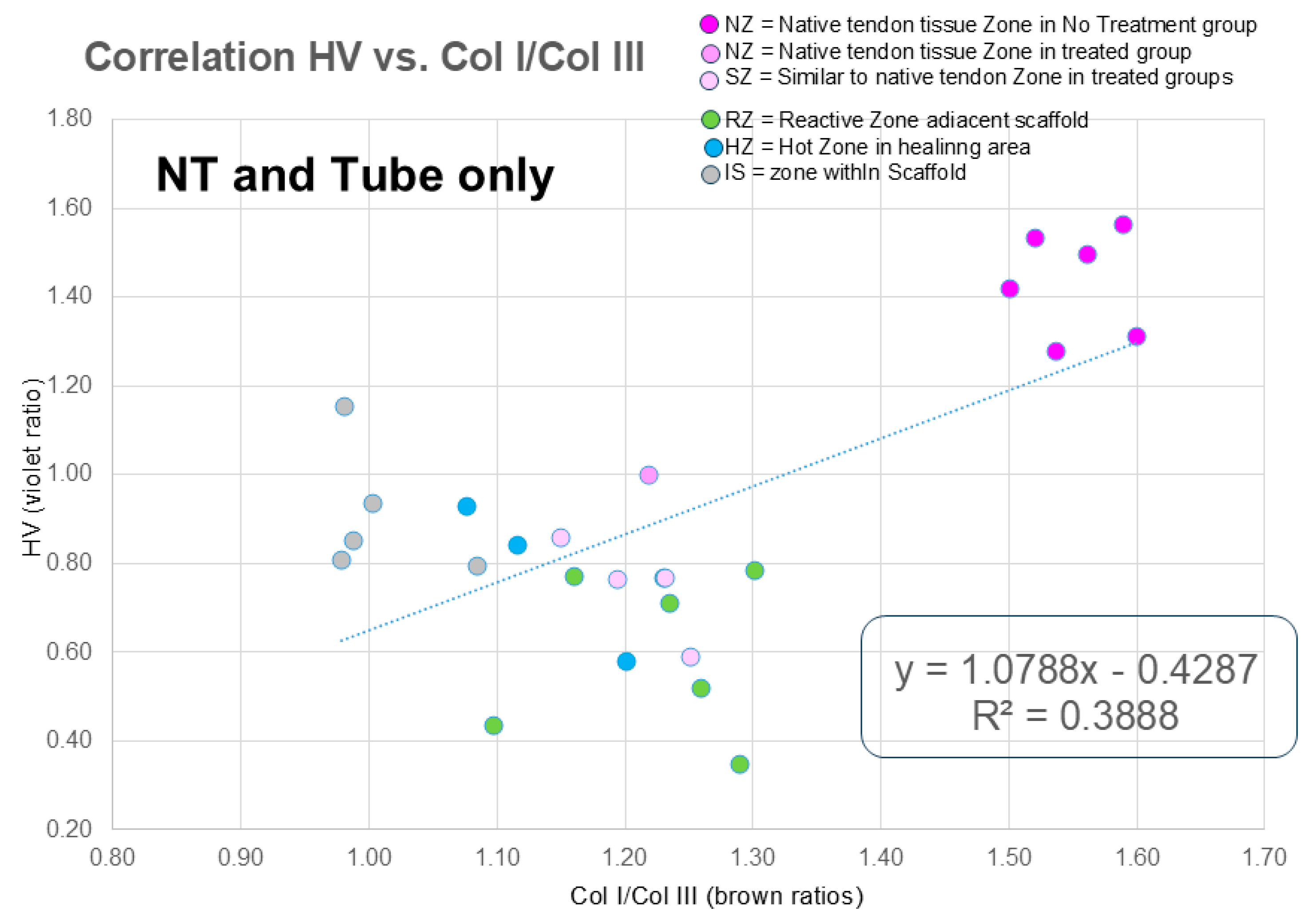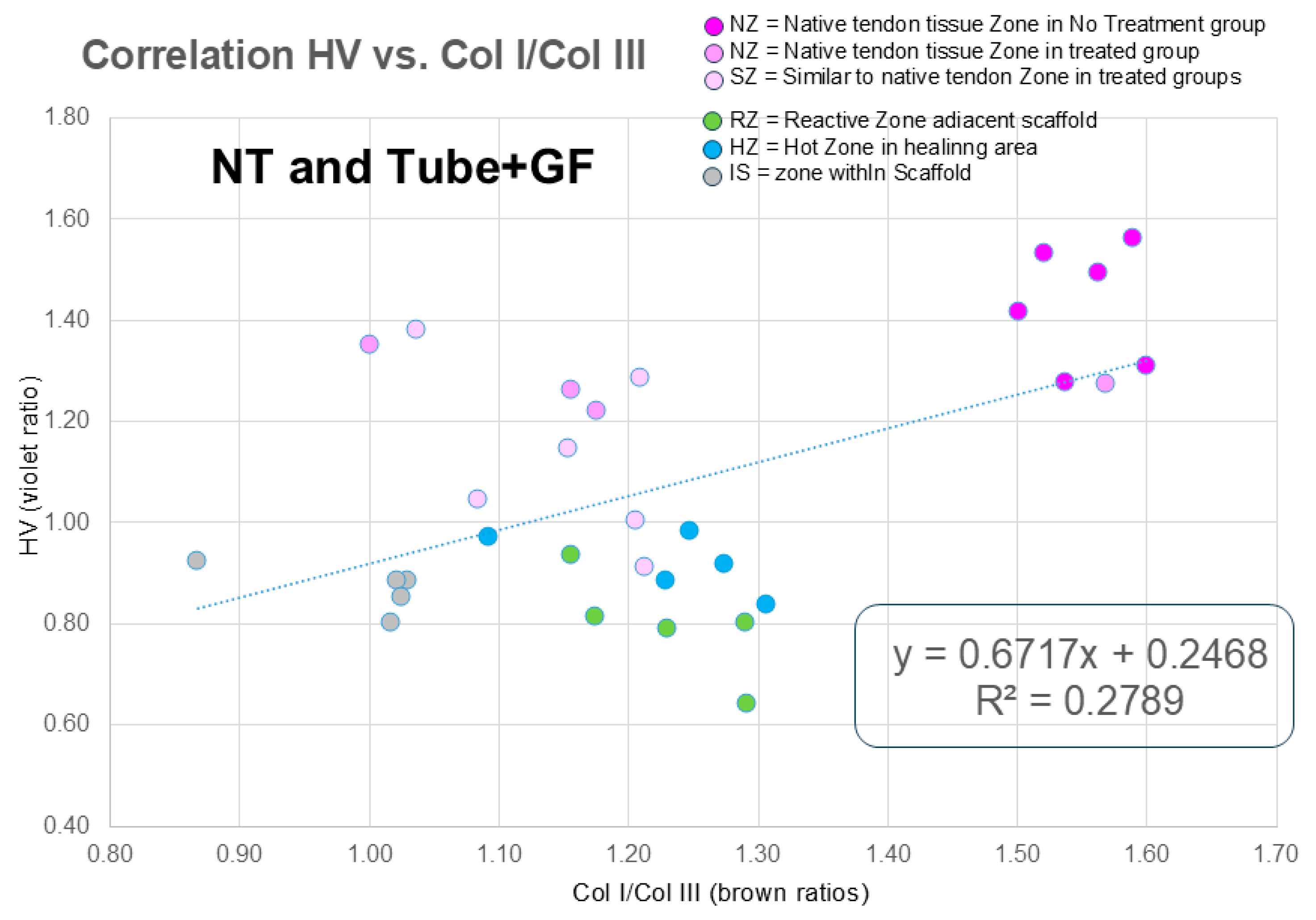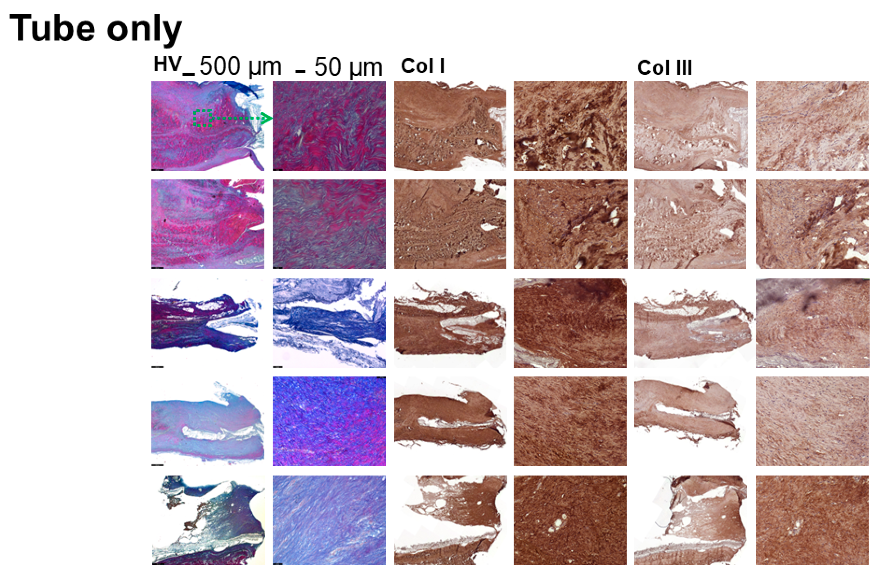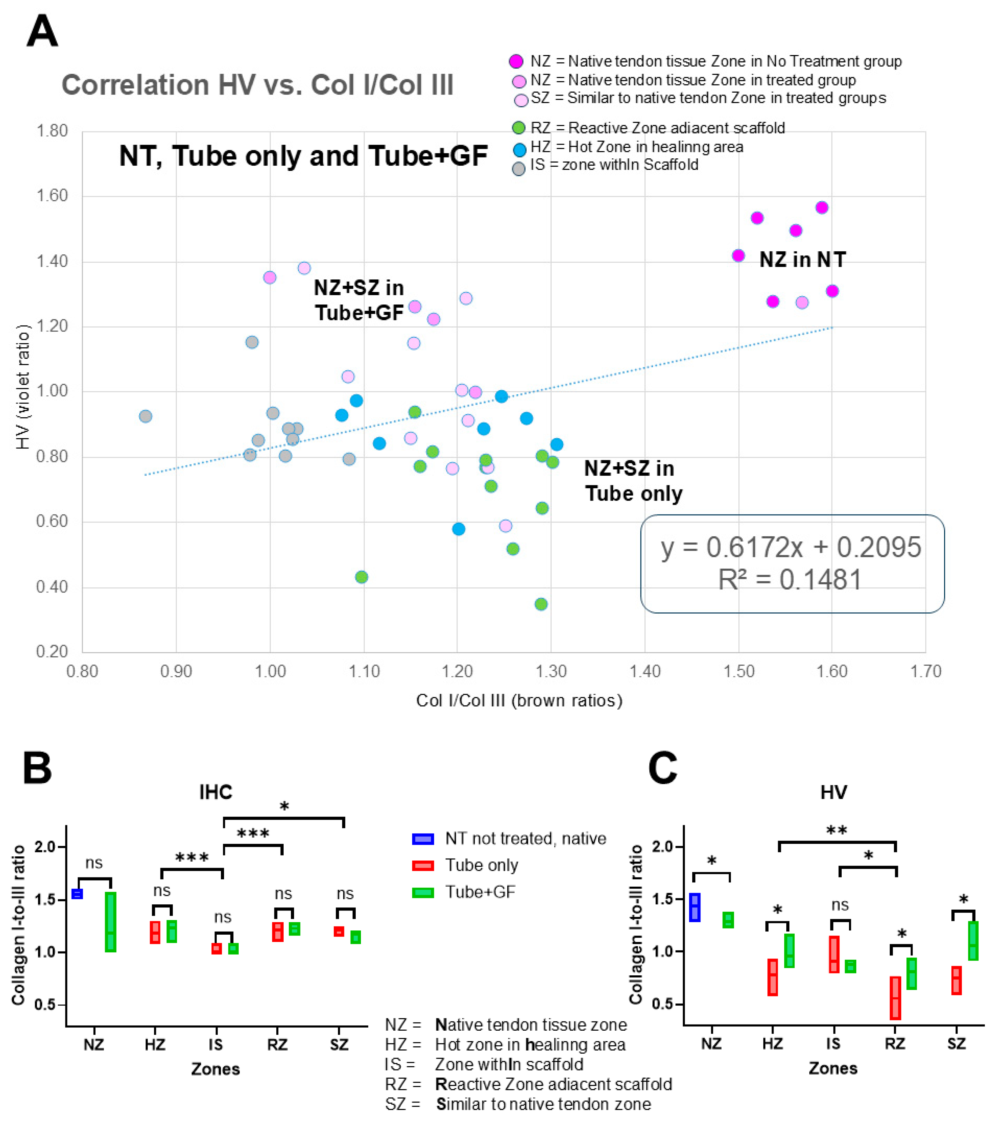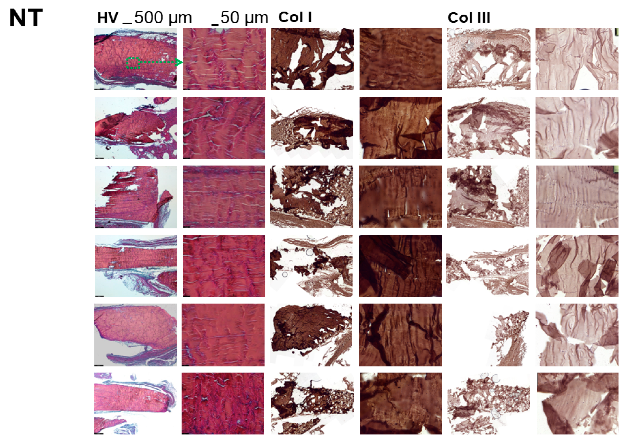 - Consistency of the two methods: HV and IHC show similar collagen I-to-III ratios for different local zones in the healing tendon tissue.