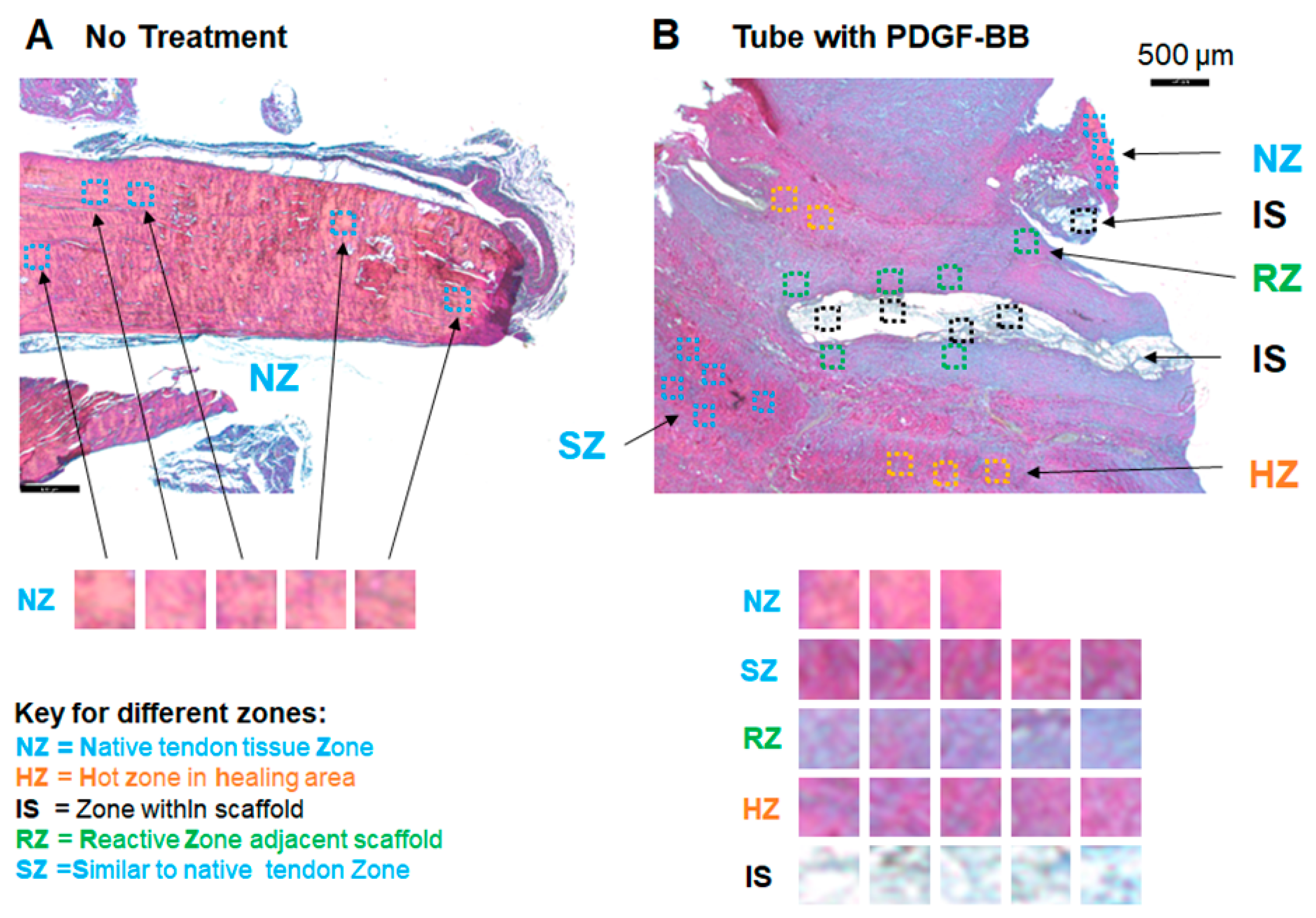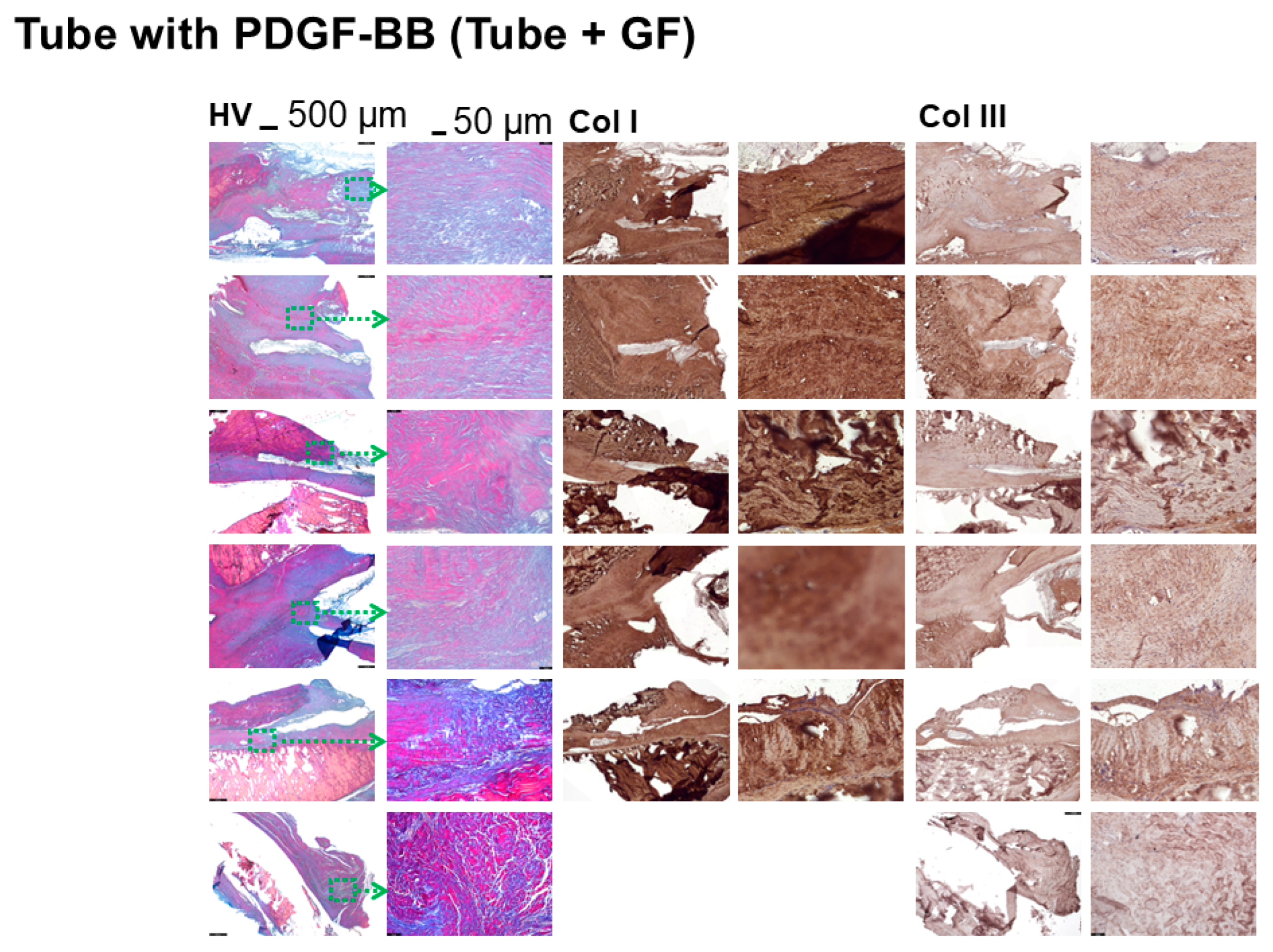 - Spatial heterogeneity: Tendons treated with a PDGF-BB tube show the most pronounced collagen I-to-III increase within the scaffold pores and immediately adjacent to the scaffolds, compared to distal regions like the tendon core.