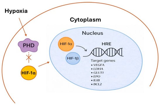 On the contrary, under hypoxic conditions, cells activate adaptive transcriptional programs that depend on HIF-1α activation. In this case, the activity of PHD enzymes is inhibited due to the limited availability of molecular oxygen, which serves as an essential co-substrate for hydroxylation. Consequently, HIF-1α remains non-hydroxylated and non-ubiquitinated, and does not undergo degradation by the proteasome. Stabilized HIF-1α accumulates in the cytoplasm, and in turn moves to the nucleus, where it forms a heterodimer with HIF-1β, generating the active transcriptional complex. This complex binds to hypoxia response elements (HREs) in the promoters of several target genes involved in processes such as angiogenesis (VEGFA), glycolytic metabolism (LDHA, GLUT1), erythropoiesis (EPO), inflammation (IL1Β), cell survival (BCL2), and migration (CXCR4) (Figure 2) [4,5]. Through this transcriptional reprogramming, HIF-1α allows cells and tissues to adapt to oxygen starvation and plays a critical role in maintaining homeostasis under hypoxic stress.