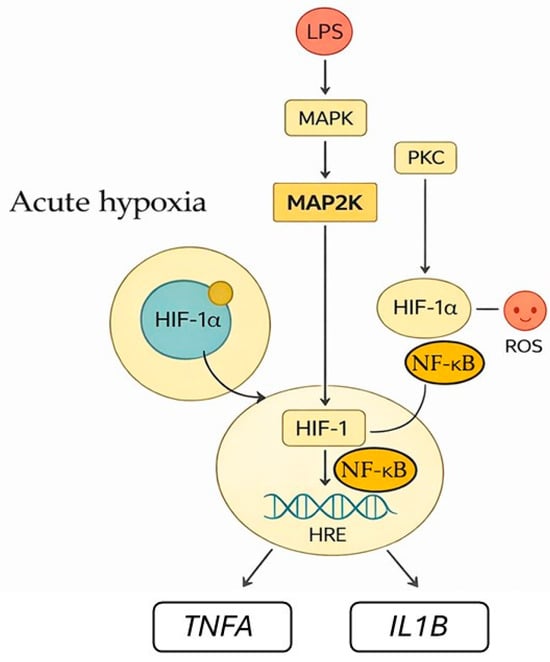 HIF-1α critically regulates hypoxia-driven reprogramming of monocyte and macrophage metabolism and effector functions, including glycolysis, cytokine production, migration, and survival [10]. However, the precise molecular mechanisms by which HIF-1α orchestrates monocyte adaptation to hypoxia and influences monocyte–macrophage differentiation remain incompletely understood. Many studies demonstrate that stabilization of HIF-1α in the cytoplasm of monocytes does not result in its translocation to the nucleus. For instance, primary human CD14+ monocytes, although able to stabilize HIF-1α under hypoxic conditions, retain it predominantly in the cytoplasm unless they are stimulated with inflammatory-like signals (lipopolysaccharide (LPS)) [13], develop sepsis [14], or are induced to differentiate into macrophages (Phorbol 12-Myristate 13-Acetate (PMA)) [15]. An interesting study conducted on human monocyte cell line THP-1 demonstrated that LPS, through the classical Toll-like receptor 4 (TRL4)- Myeloid Differentiation Primary Response 88 (Myd88)-dependent signaling pathway, induced increased HIF-1α transcription and protein stabilization in monocytes differentiated into macrophages. Interestingly, this activation was independent of NF-ĸB activity, but dependent on the presence of reactive oxygen species (ROS) [16]. The requirement for further stimulus (LPS) ensures that HIF-1α-driven inflammatory transcription occurs primarily in the context of infection or tissue injury, rather than systemic hypoxemia. Under normoxic conditions, but in an inflammatory context, ROS can stabilize HIF-1α by promoting its binding to the HRE element present in the IL1B promoter and inducing its transcription [17,18].