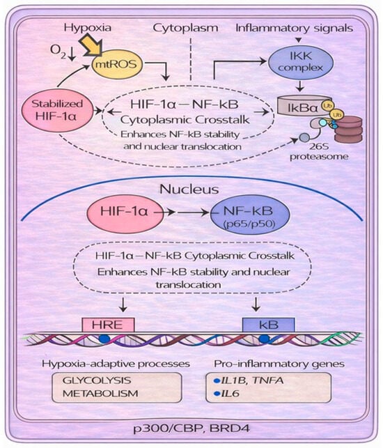 Hypoxia-induced mitochondrial ROS production acts as a critical amplifier of both HIF-1α and NF-κB signaling. ROS-mediated inhibition of PHD enzymes stabilizes HIF-1α, while reduced PHD-dependent hydroxylation of the IKK complex allows for NF-κB activation through IκBα degradation. PKC further enhances NF-κB signaling, establishing a functional convergence between PKC and NF-κB pathways under hypoxic conditions. NF-κB activation promotes the transcription of pro-inflammatory cytokines and chemokines, including IL-1β, TNF-α, CCR2, and CXCR4, thereby facilitating monocyte recruitment, survival, and inflammatory amplification. Once stabilized, HIF-1α and NF-κB engage in a bidirectional crosstalk that reinforces hypoxia-driven inflammation. NF-κB induces HIF-1α transcription, while HIF-1α cooperates with NF-κB at both cytoplasmic and nuclear levels, sharing transcriptional coactivators such as p300/CBP and BRD4. This coordinated interaction ensures that cytokine and chemokine production is tightly coupled with metabolic reprogramming and hypoxic adaptation, integrating inflammatory signaling with cellular survival programs.