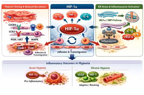 Hypoxia-driven regulation of monocyte migration and inflammatory responses. Hypoxia promotes monocyte recruitment by upregulating chemokine receptors (CXCR4, CCR2) and activating PI3K/AKT and MAPK signaling, thereby enhancing migration and survival. Concurrently, hypoxia-induced endothelial activation increases ICAM-1 and VCAM-1 expression, facilitating monocyte adhesion and trans-endothelial migration. Hypoxia stabilizes HIF-1α, a central regulator of inflammatory responses that induces pro-inflammatory cytokines, including IL-1β, TNF-α, and IL-6, directly or through crosstalk with NF-κB. Endoplasmic reticulum stress further amplifies HIF-1α-dependent cytokine production via the IRE1α/XBP1 pathway and inflammasome activation. The inflammatory outcome is context-dependent, with acute hypoxia favoring pro-inflammatory responses and chronic hypoxia promoting adaptive and resolving programs characterized by VEGFA and heme oxygenase-1 (HO-1) protein expression.