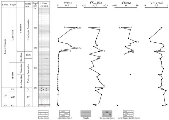 Pyrite sulfur isotopes were introduced to reconstruct the ocean chemistry of the Phanerozoic biodiversity and extinction [15,20,30,31,32]. We used δ34S of pyrite to evaluate the influence of ocean chemistry during the Permian–Triassic crisis. Only two δ34Ss for pyrite values were detected from the Gufeng to the Yinkeng Formation due to the extremely low pyrite content (Figure 2). Figure 2 demonstrates that the δ34S values exhibit a wide range from the late Smithian to the middle Spathian. A positive δ34S excursion occurs from –6.0‰ to +18.9‰ (S1 in Figure 2) in the lowermost Spathian. This positive δ34S excursion may be associated with the short-lived oxic bottom-water conditions suggested by a lower V/(V + Ni) ratio (0.42) (Figure 2). Tian et al. also reported this oxic event during this interval [33]. The δ34S values first exhibit a stepwise negative excursion and then a stepwise positive excursion in the early Spathian, which reaches +34.2‰ in the late early Spathian (S2 in Figure 2). This positive excursion suggests oxic bottom-water conditions, which are also evidenced by the V/(V + Ni) ratio and pyrite content. The δ34S values exhibit a stepwise negative trend from the late early Spathian to the middle Spathian. A negative δ34S shift of ~30‰ is exhibited in the middle Spathian (S3 in Figure 2) which is associated with euxinia during episode II.