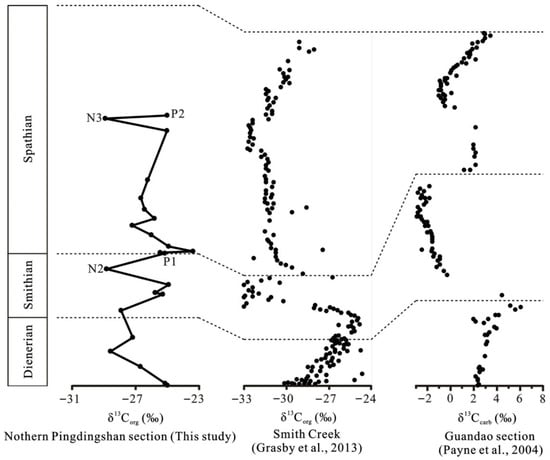 In the northern Pingdingshan section of the Chaohu area, the δ13Corg values display stable characteristics in the Roadian–Wordian, followed by a positive excursion of ~2‰ in the Roadian–Wordian to Wuchiapingian boundary. The δ13Corg values exhibit a stepwise positive shift in the Changhsingian, followed by a 2–3‰ decline in the Permian–Triassic boundary. There was a brief stepwise positive excursion in the Early Griesbachian, followed by a continued decline in δ13Corg through the Early Griesbachian to Middle Dienerian, suggesting that the initial biotic recovery after the Permian–Triassic crisis was winding or aborted. The sustained anoxia evidenced by V/(V + Ni) ratios during Early Triassic may have been responsible for the aborted initial recovery. There is a 4‰ negative δ13Corg excursion in the late Smithian. The similarly negative excursions of δ13Corg in the late Smithian are also reported in the Smith Creek section of the Sverdrup Basin in Canada [10], Guandao section in Guizhou, China [34], and Zal section in Iran [35]. The δ13Corg excursion ranges reach up to 9‰ in the Smith Creek section (Figure 3). This negative shift is associated with anoxic conditions that resulted in the Smithian ammonoid and conodont extinction [9,36]. A high temperature was also a critical contributor to the end-Smithian crisis [37]. Climatic warming dating from the earliest Smithian and sea surface temperatures in the late Smithian may have reached a peak of ~40 °C based on the conodont oxygen isotopes [37,38].