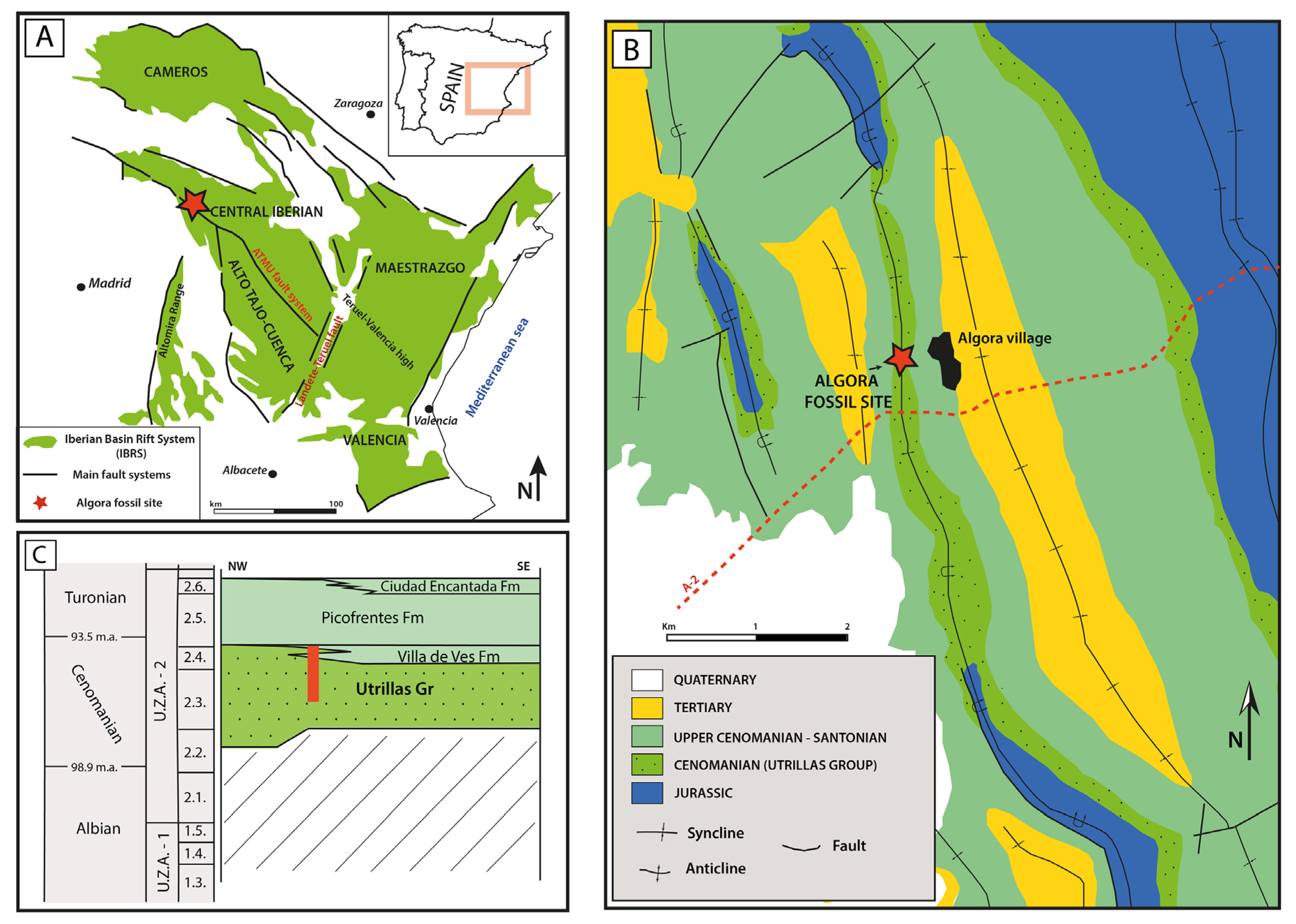 - Torices, A.; Barroso-Barcenilla, F.; Cambra-Moo, O.; Pérez-García, A.; Segura, M. Palaeontological and palaeobiogeographicalimplicationsofthe new Cenomanianvertebrate site of Algora, Guadalajara, Spain. Cretac. Res. 2012, 37, 231–239. [Google Scholar] [CrossRef]