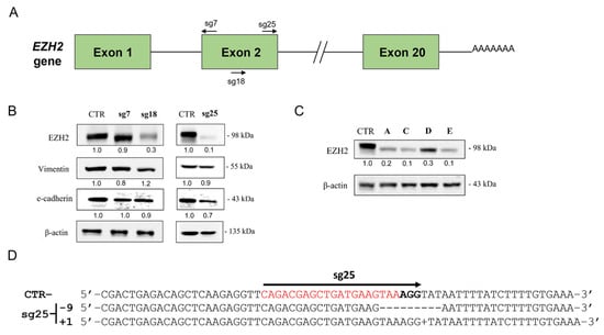 EZH2 gene editing using CRISPR/Cas9. (A) Schematic view of EZH2 gene with introns and exons. The sgRNAs (sg7, sg18, and sg25) targeted the EZH2 gene at different positions close to the second exon, near the ATG start codon. (B) EZH2, E-cadherin, and vimentin protein levels in A549-sgRNA 7, 18, and 25 compared to A549-CTR by Western blot. (C) EZH2 protein expression in clonal populations (Cl) ClA, ClC, ClD, and ClE derived from CRISPR/Cas9-edited A549-sg25 cells. Expression was normalized using β-actin. (D) Genomic DNA sequencing of A549-sg25 after CRISPR/Cas9 editing of EZH2 gene. sgRNA target regions are highlighted in red, and PAM sequence is in bold. dsDNA repair resulted in a 9 nt deletion and 1 nt addition to the EZH2 gene in A549-sg25. Sg, single guide; CTR, control; cl, clone; PAM, protospacer adjacent motif; dsDNA, double-strand break DNA.