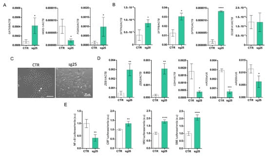 CRISPR/Cas9 targeting of the EZH2 gene improves differentiation and induces epithelial–mesenchymal transition in lung cancer cells. (A) RT-qPCR analysis of gene expression of the transcription factors NKX2-1, GATA5, and FOXA2 and (B) lung surfactant genes SFTPA2, SFTPB, SFTPC, and SCGB1A1. ACTB was used as an endogenous control. (C) Photomicrograph showing morphology of A549-CTR and A549-sg25 cells in culture. Magnification 100×. Scale bar: 30 μm. (D) Gene expression analysis of mesenchymal transcription factors ZEB1/2 and the epithelial gene CDH1. RPL19 was used as an endogenous control. RT-qPCR analysis of miR200a (left) and miR200c (41) gene expression. RNU6B was used as an endogenous control. (E) Luciferase reporter gene assay to evaluate the activity of the NF-κB, Notch, Wnt/β-catenin, and TGF-β signaling pathways. Luciferase activity was normalized using renilla activity. Data are expressed as mean ± SD (n = 3) for gene expression. a.u., arbitrary units; *, p < 0.05; **, p < 0.01; ***, p < 0.001; ****, p < 0.0001 vs. A549-CTR.